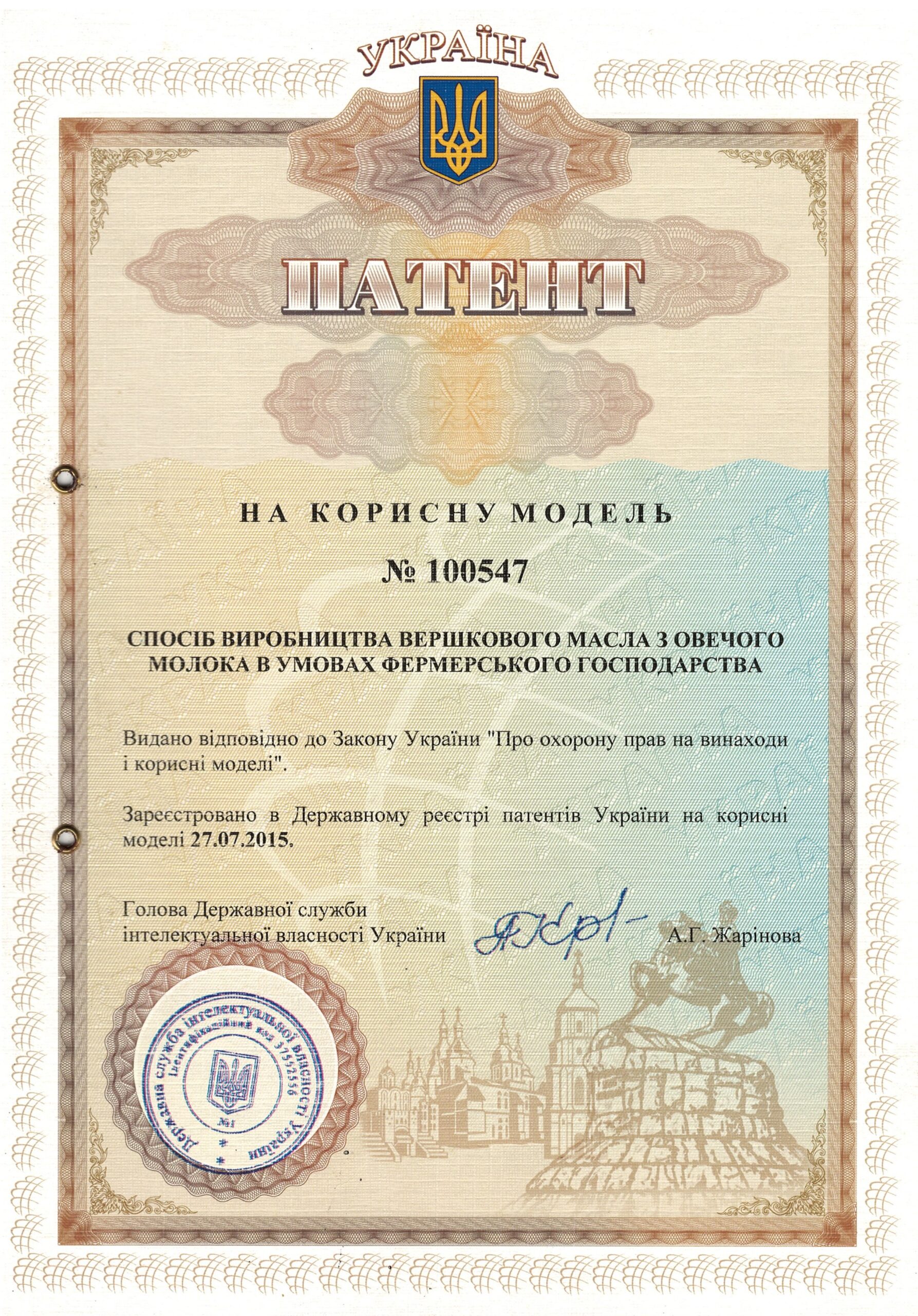 | 5 | Спосіб вироблення вершкового масла з овечого молока в умовах фермерського господарства | 100547, 27.07.2015 | На корисну модель |