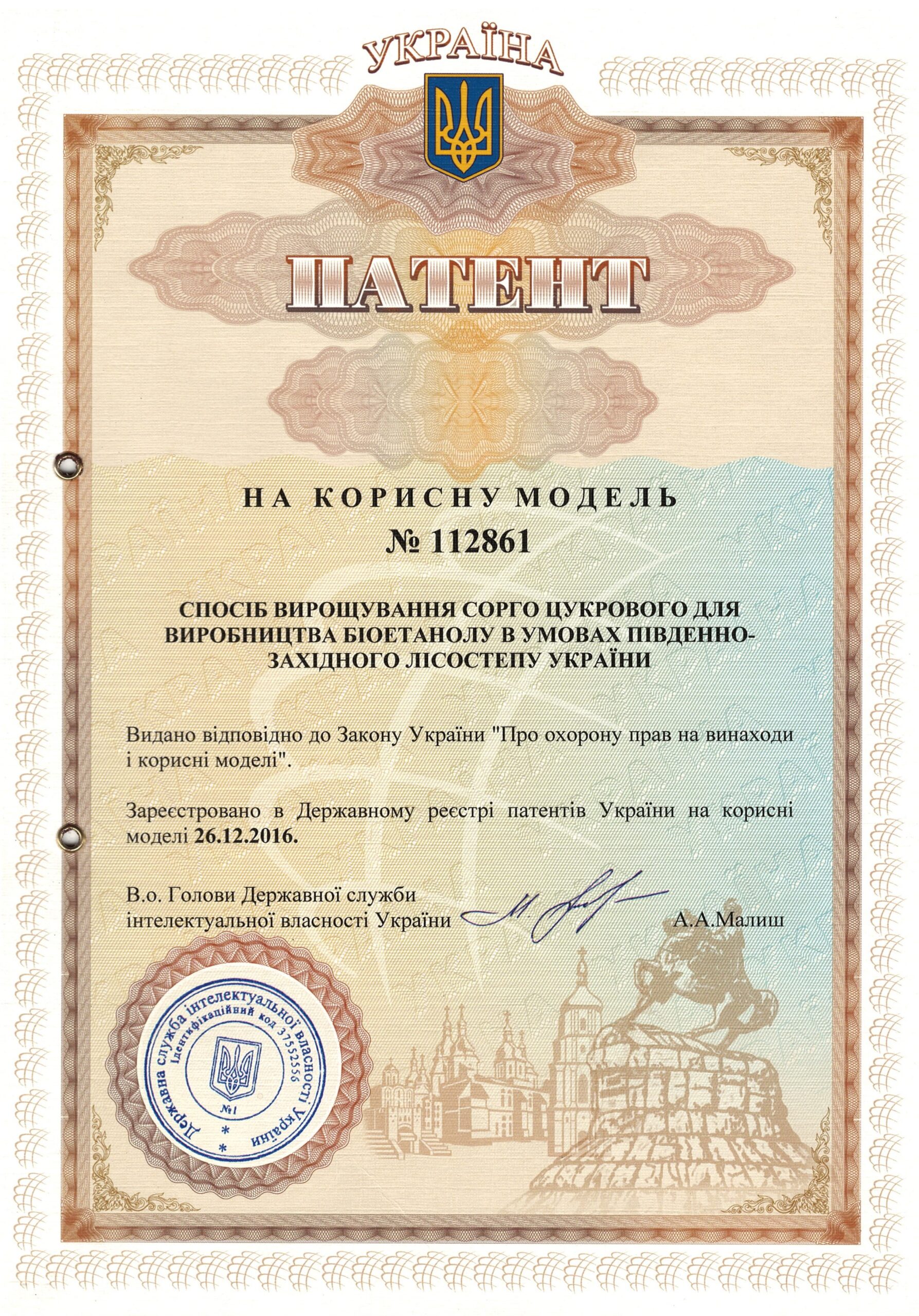 | 6 | Спосіб вирощування сорго цукрового для виробництва біоетанолу в умовах південно-західного лісостепу України | 112861, 26.12.2016 | На корисну модель |