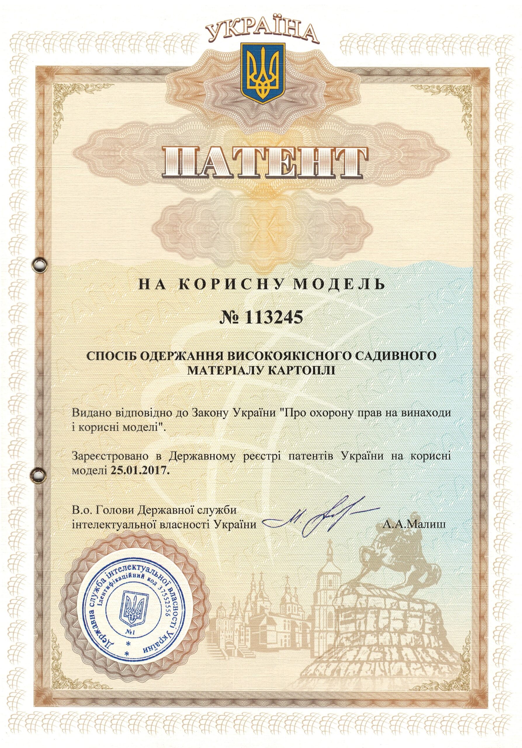 | 7 | Спосіб одержання садивного матеріалу картоплі | 113245, 25.01.2017 | На корисну модель |