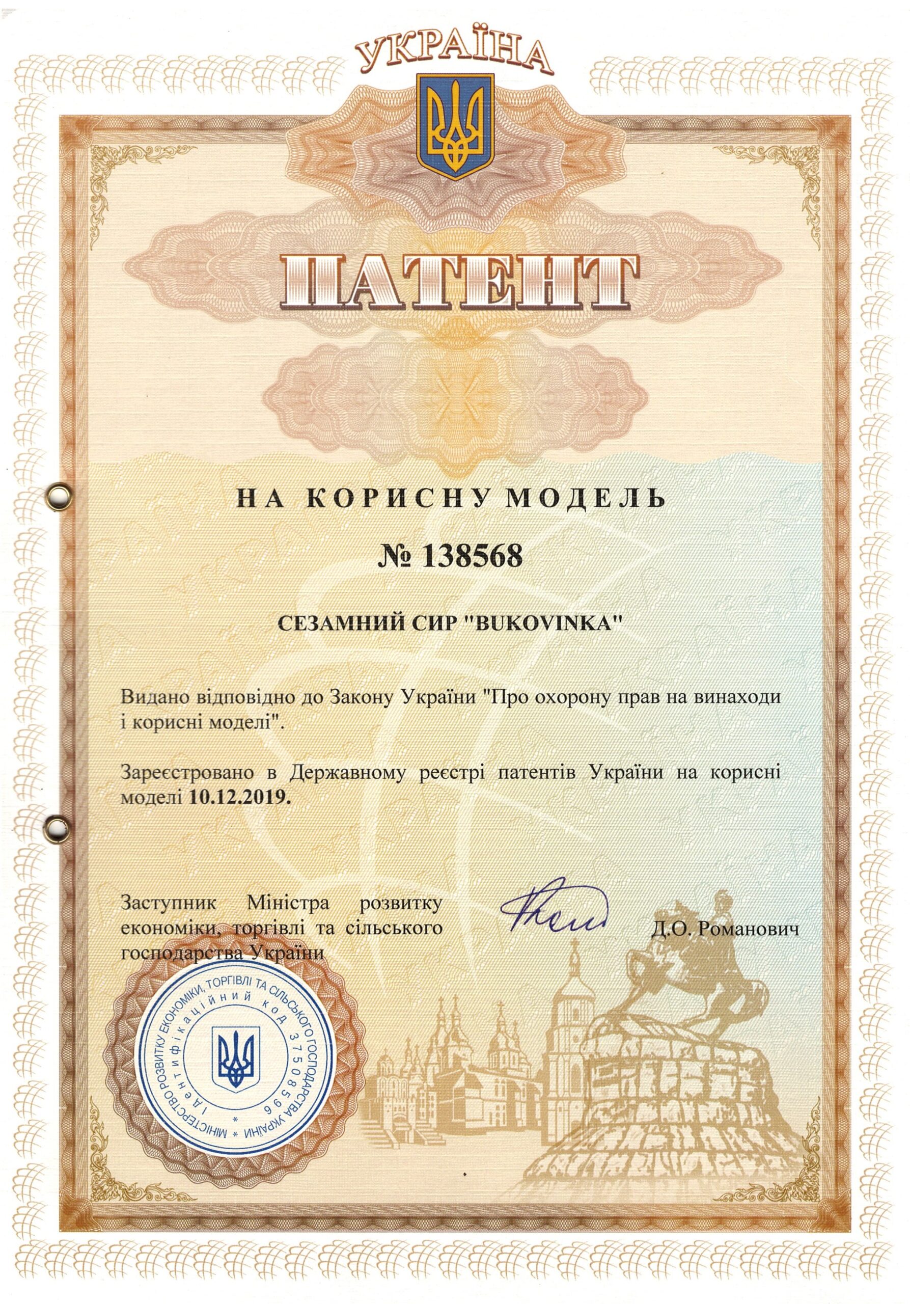 | 9 | Сезамний сир «Буковинка | 138568, 10.12.2019 | На корисну модель |