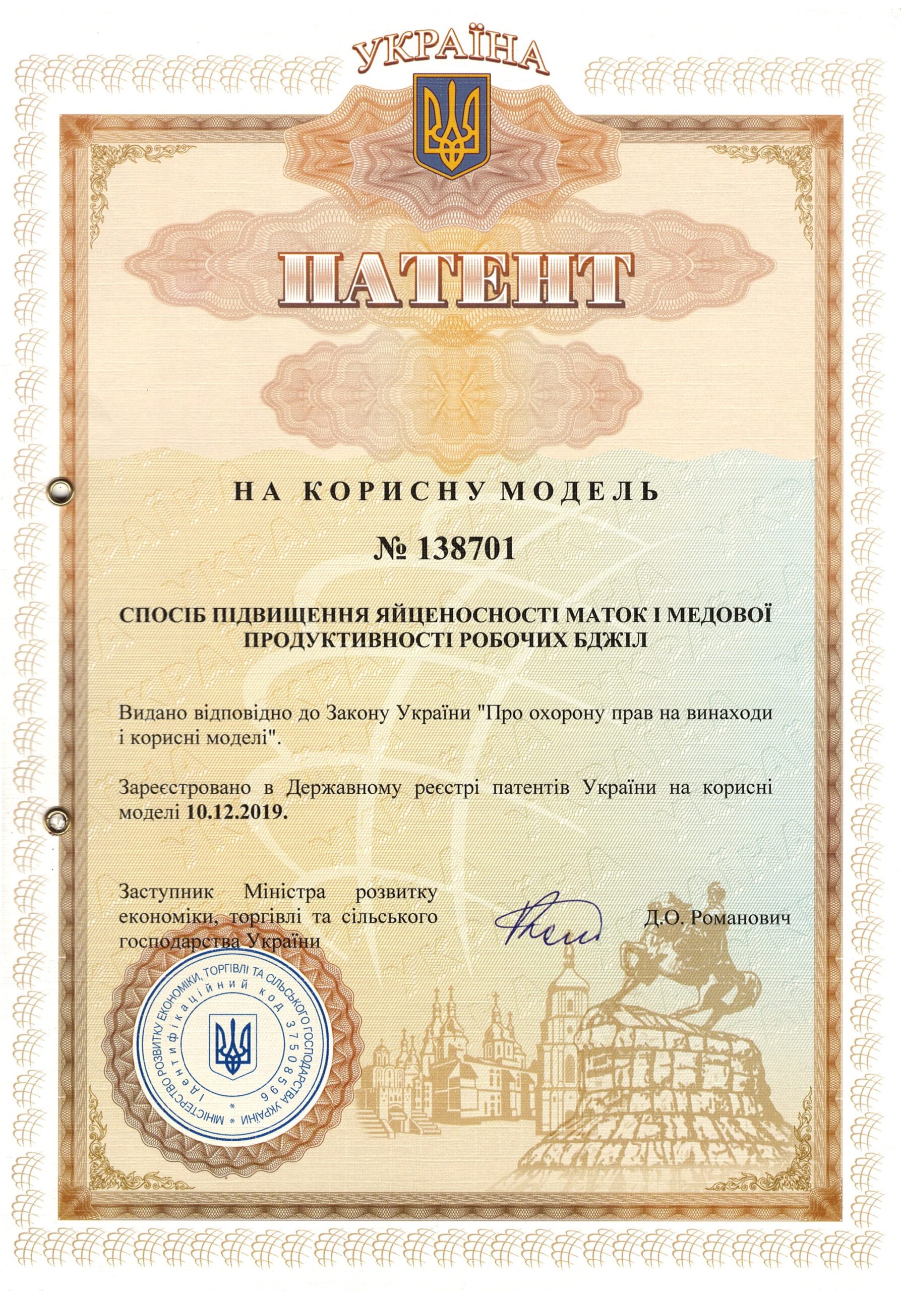 | 10 | Спосіб підвищення яйценосності маток і медової продуктивності робочих бджіл | 138701, 10.12.2019 | На корисну модель |