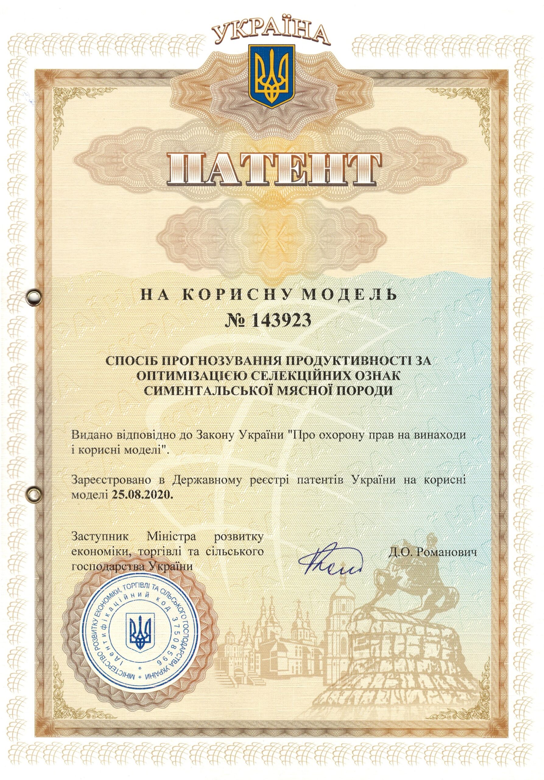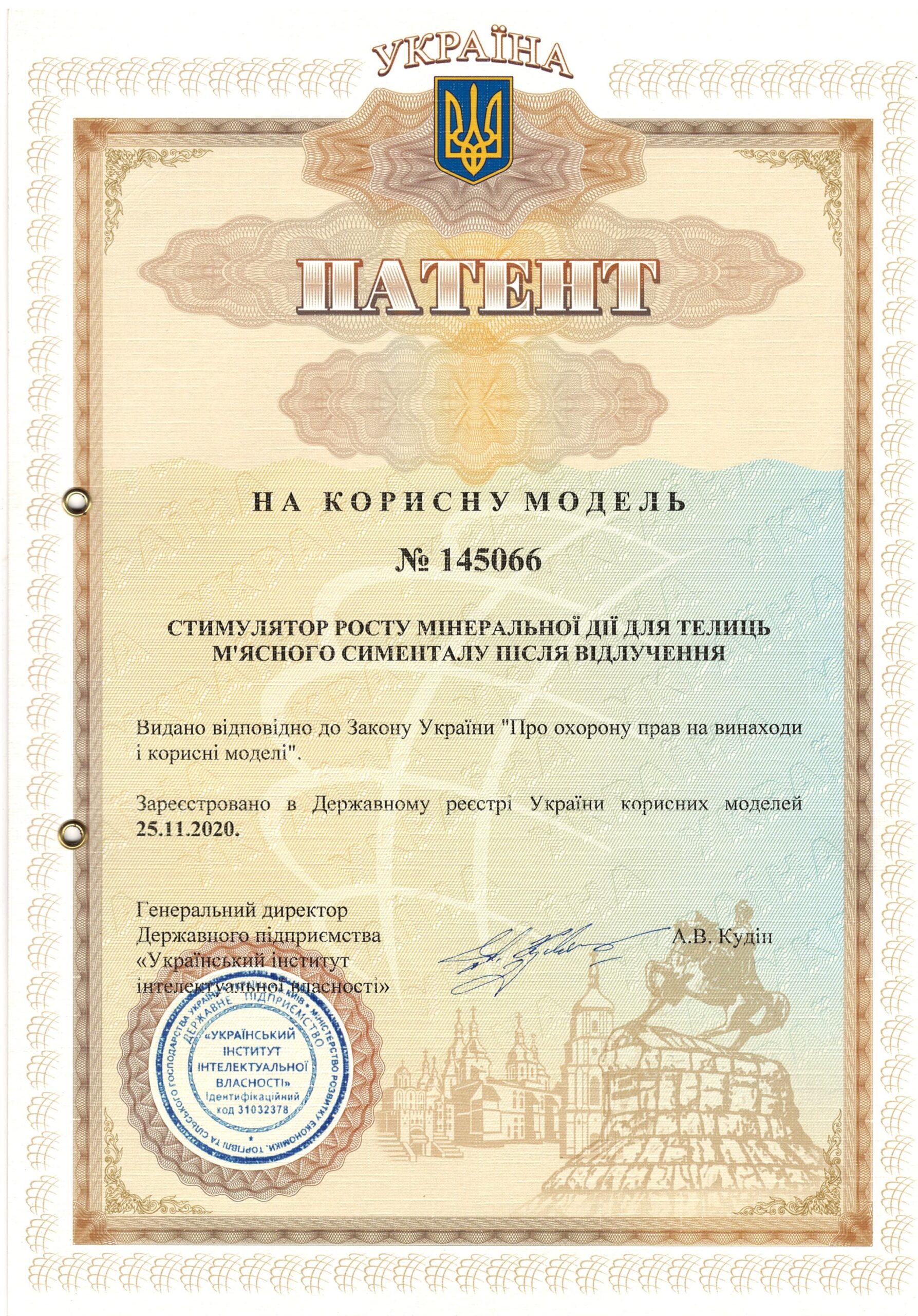 | 13 | Стимулятор росту мінеральної дії для телиць м’ясного сименталу після відлучення | 145066, 25.11.2020 | На корисну модель |