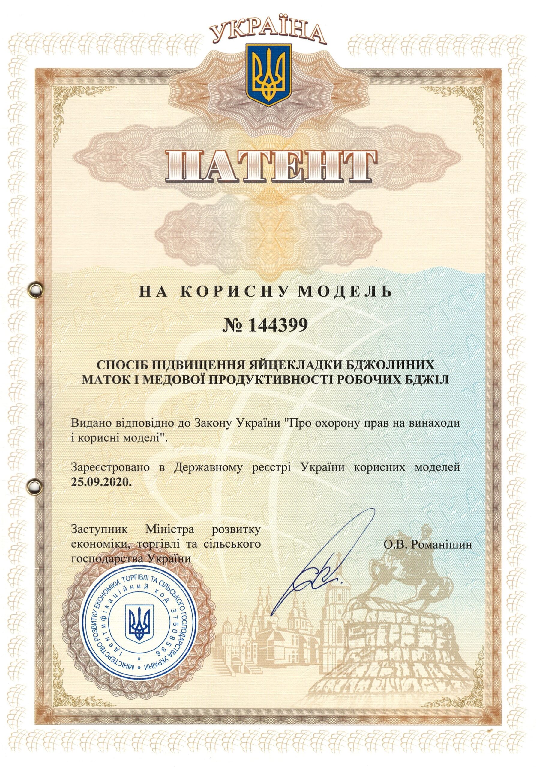 | 12 | Спосіб підвищення яйцекладки бджолиних маток і медової продуктивності робочих бджіл | 144399, 25.09.2020 | На корисну модель |
