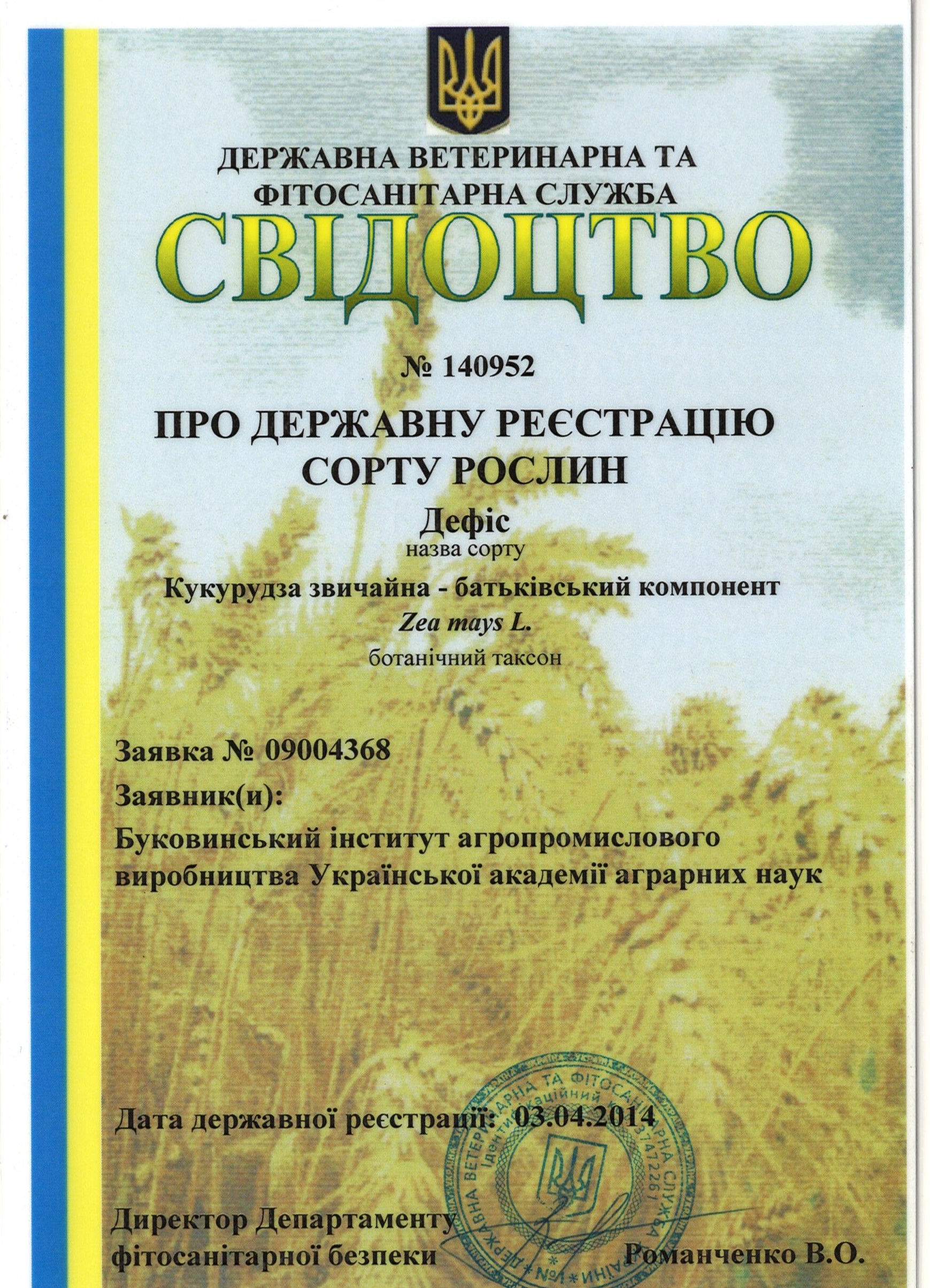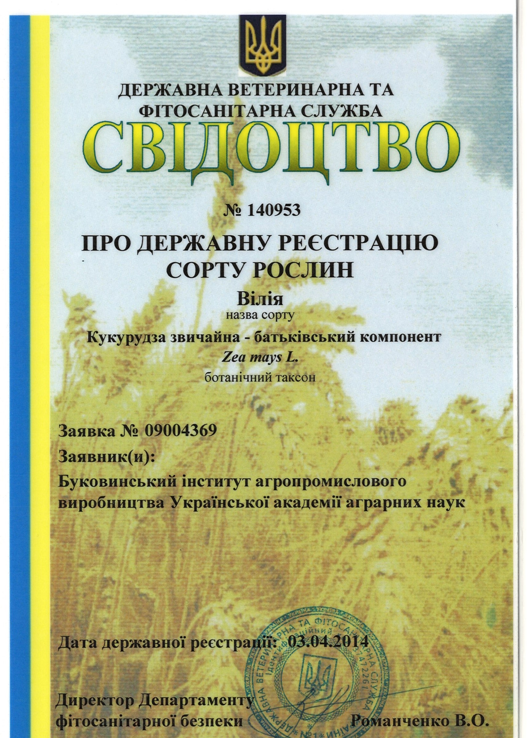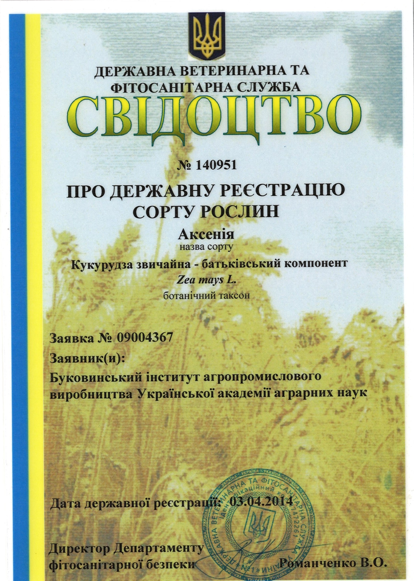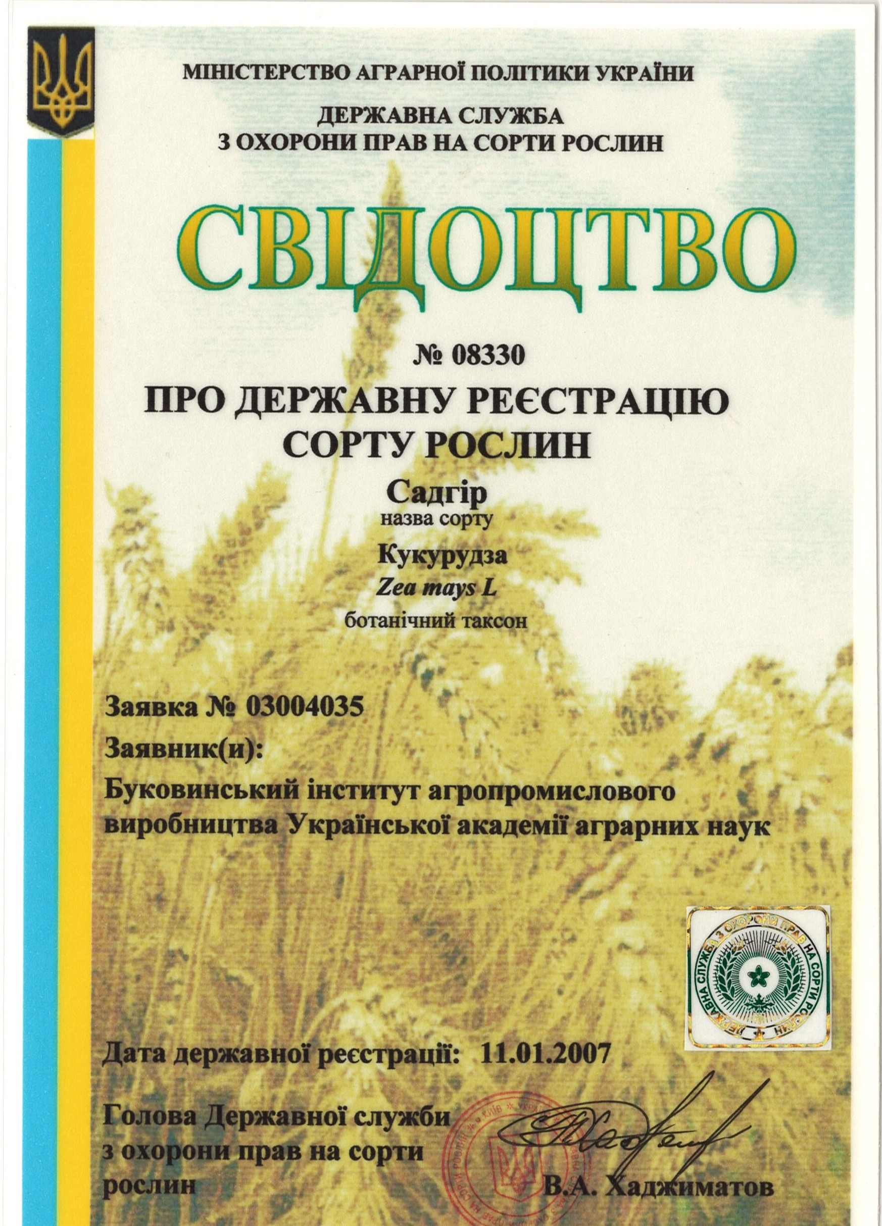 | 11.01.2007 | Кукурудза | Садгір | 03004035 | Свідоцтво №08330 |