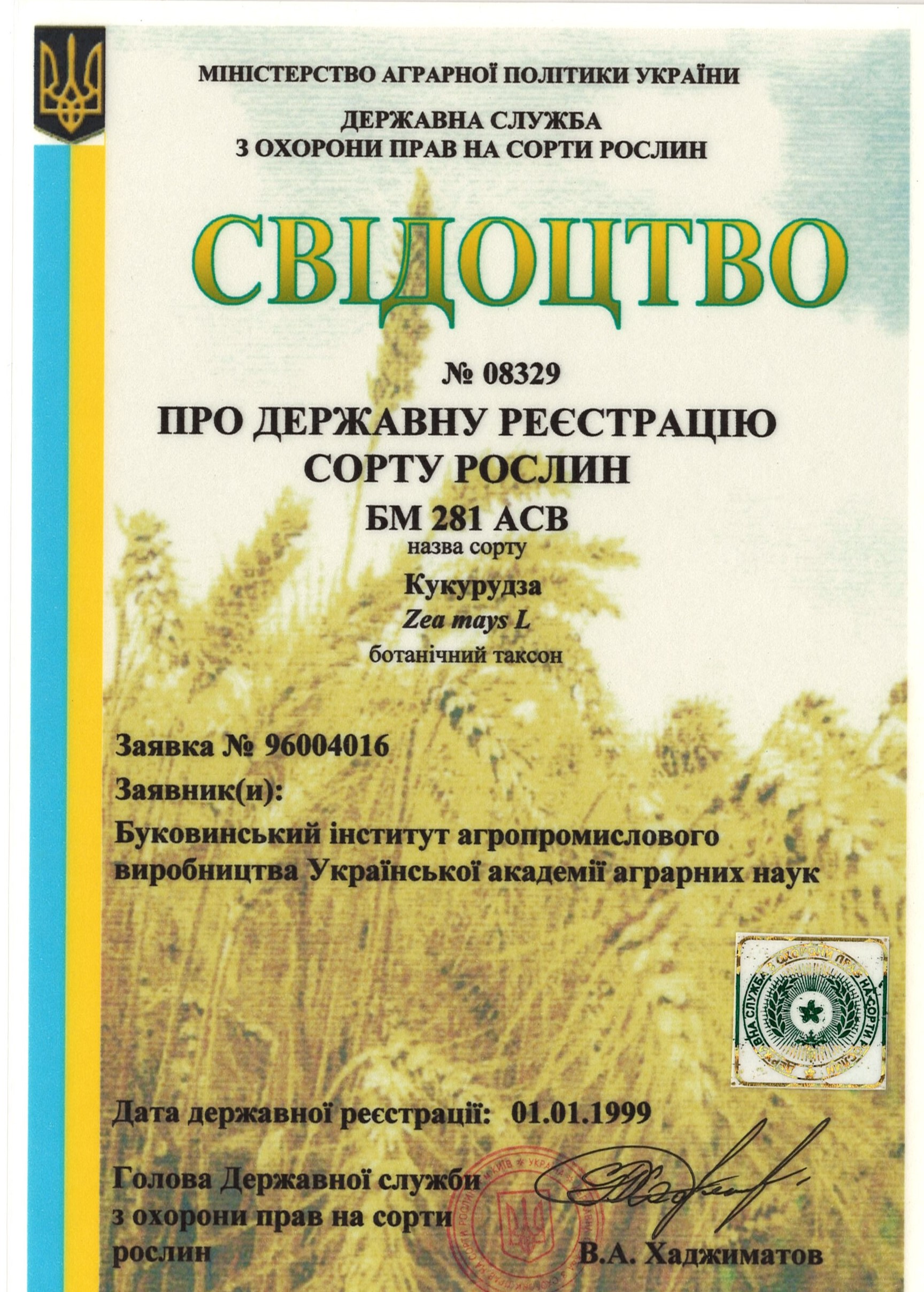 | 01.01.1999 | Кукурудза | БМ 281 АСВ | 96004016 | Свідоцтво №08329 |