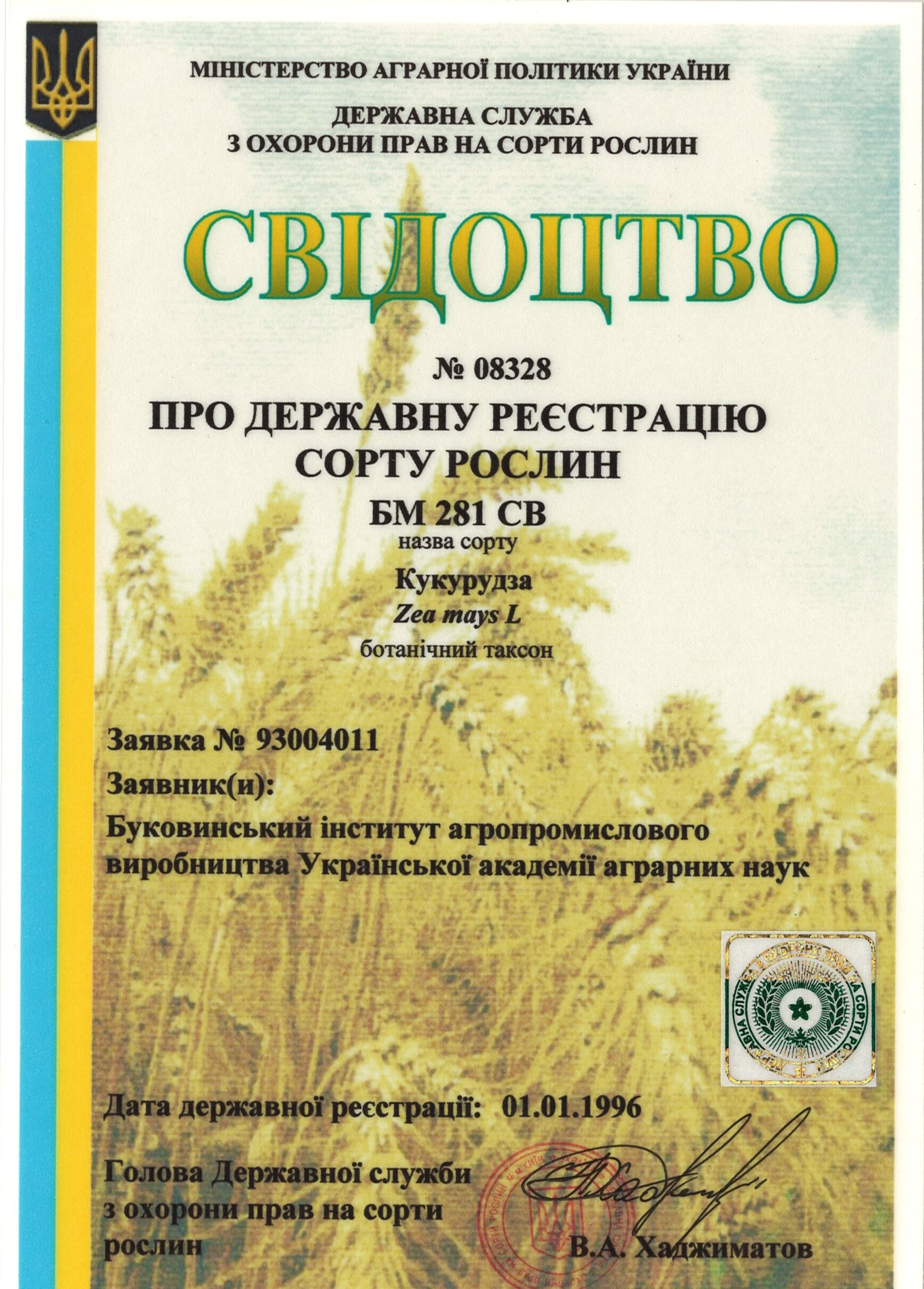 | 01.01.1996 | Кукурудза | БМ 281 СВ | 93004011 | Свідоцтво №08328 |
