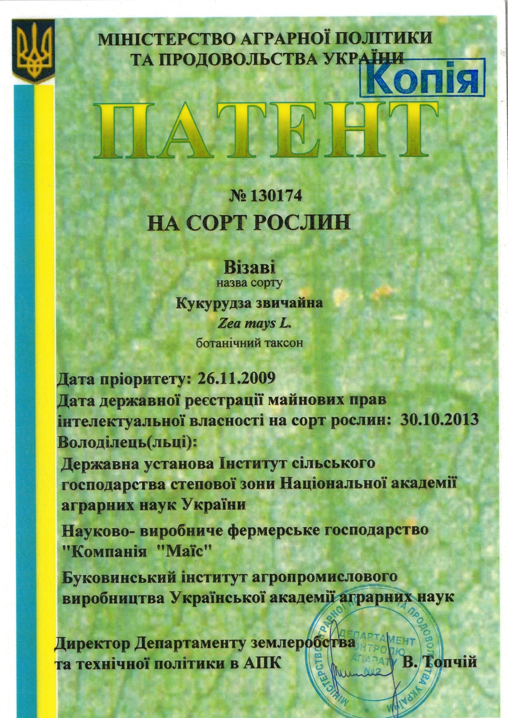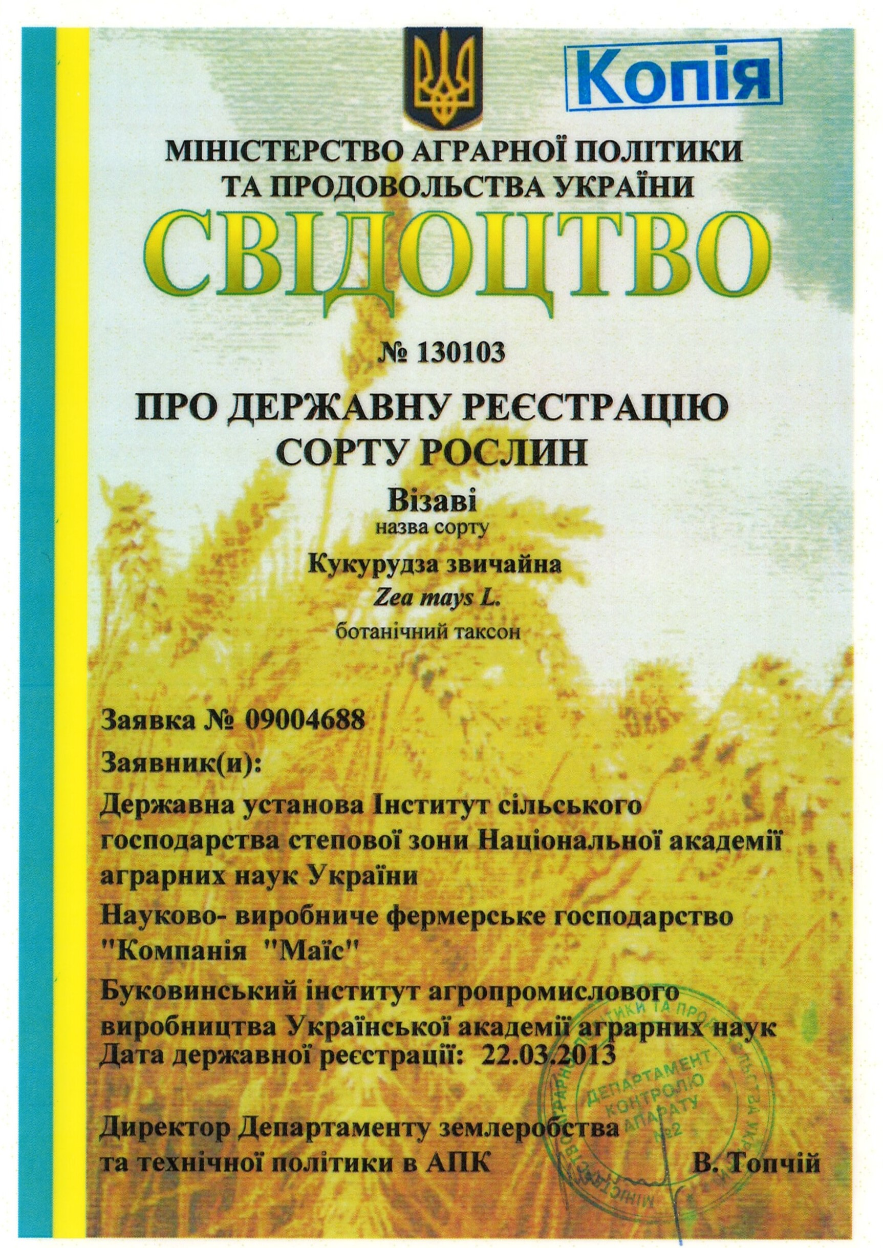 | 22.03.2013 | Кукурудза звичайна | Візаві | 09004688 | Свідоцтво №130103 |