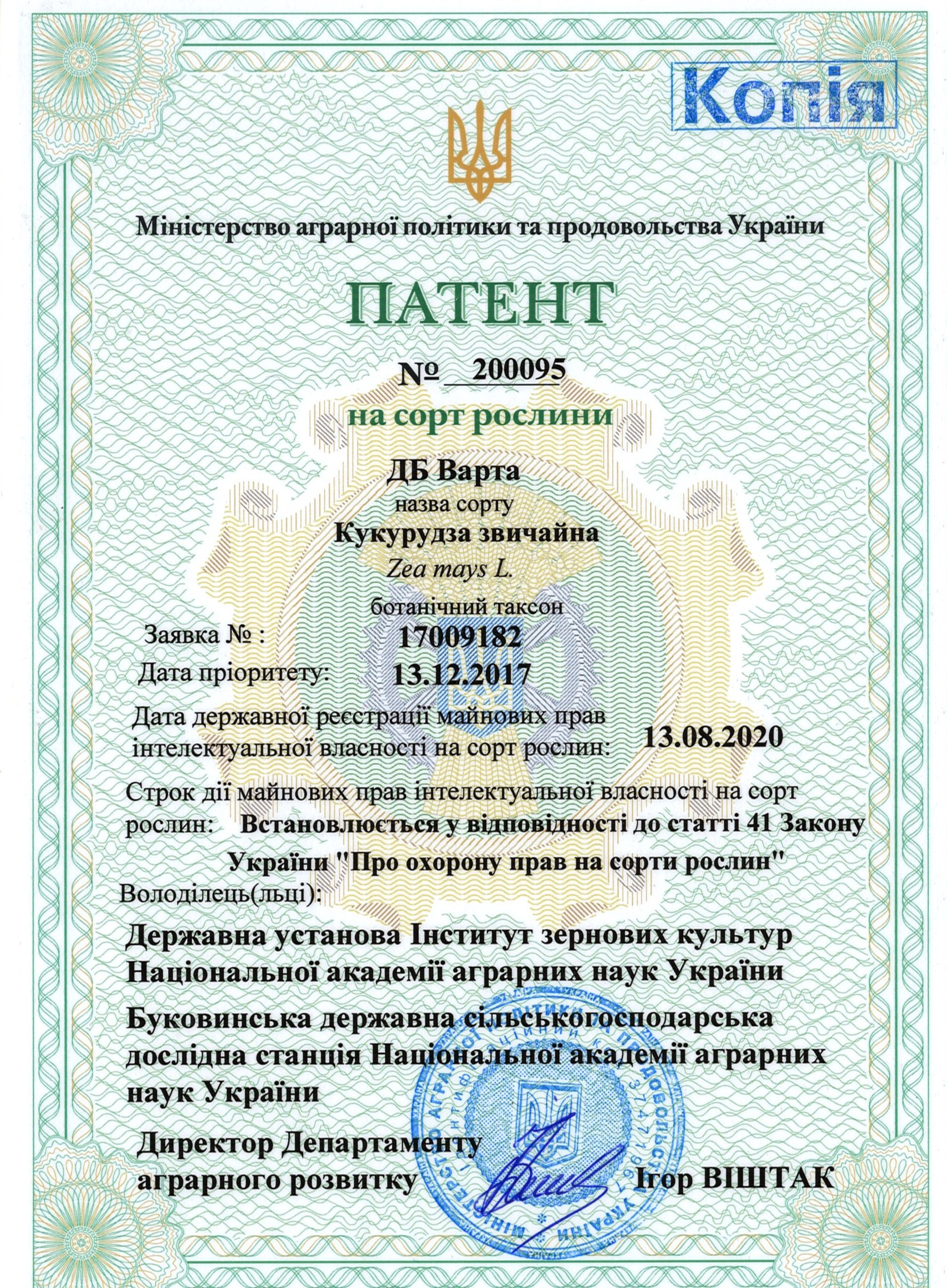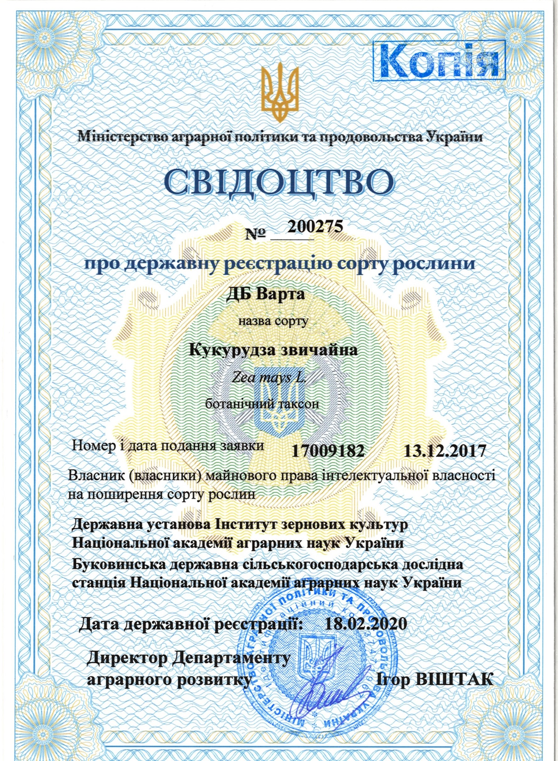 | 18.02.2020 | Кукурудза звичайна | ДБ Варта | 17009182 | Свідоцтво № 200275 |