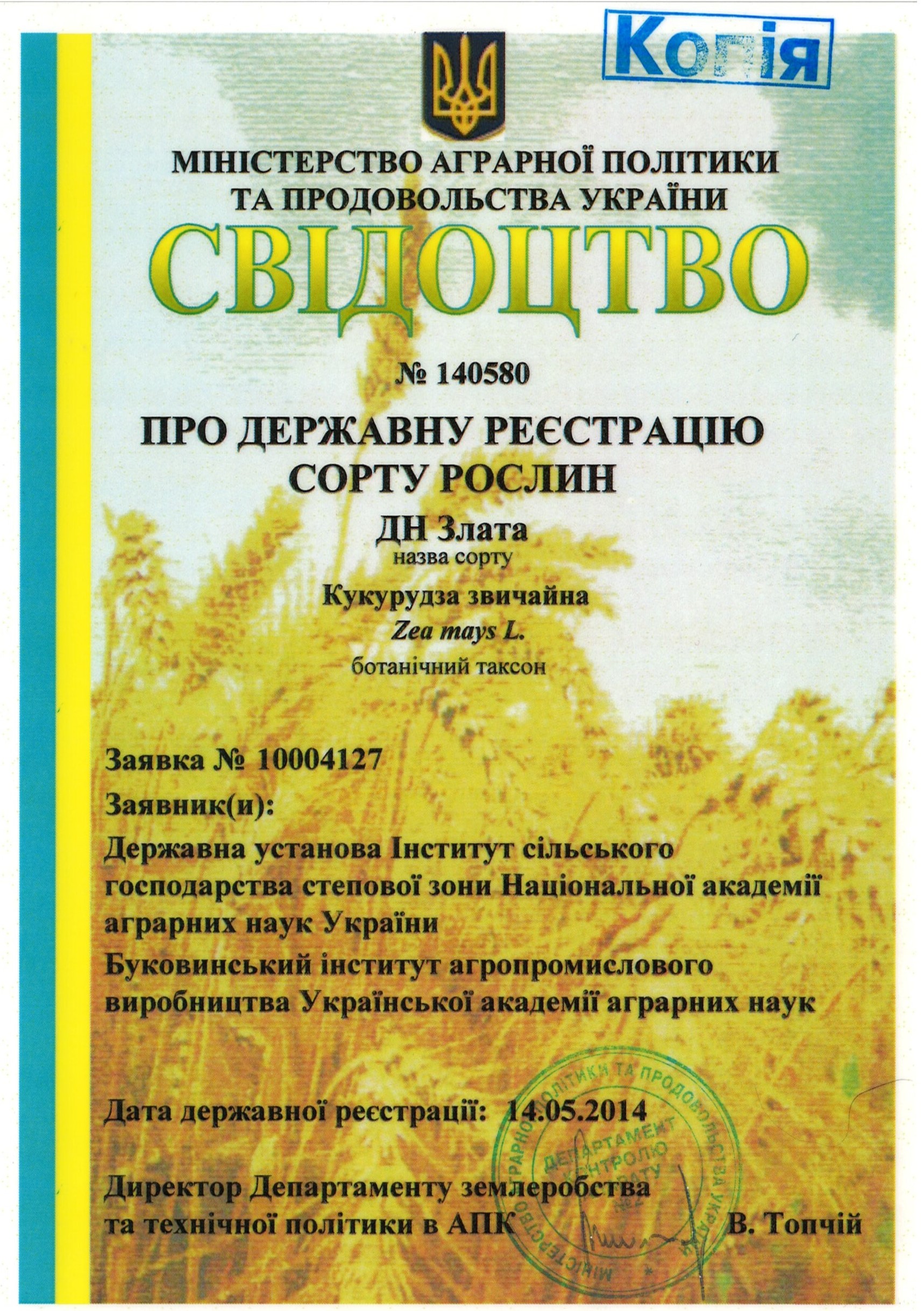 | 14.05.2014 | Кукурудза звичайна | ДБ Злата | 10004127 | Свідоцтво № 140580 |