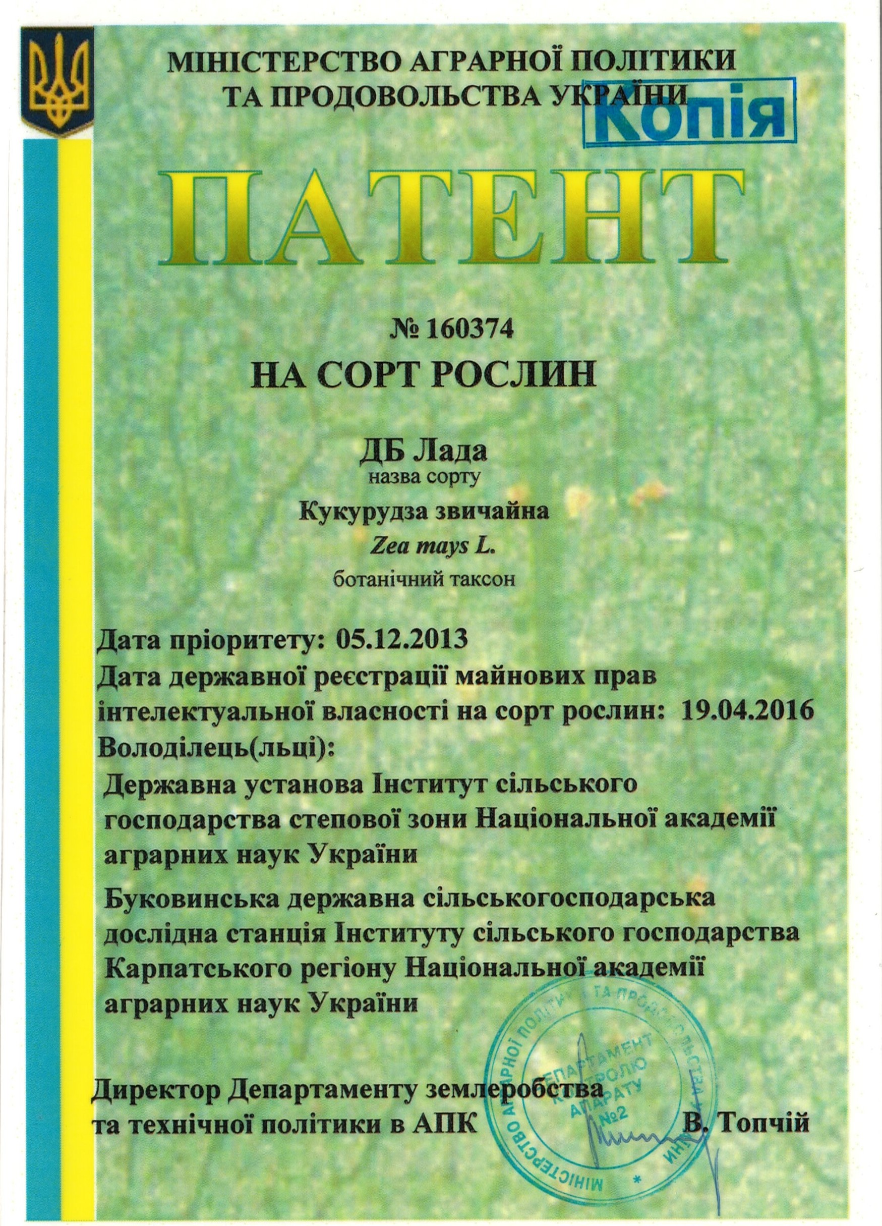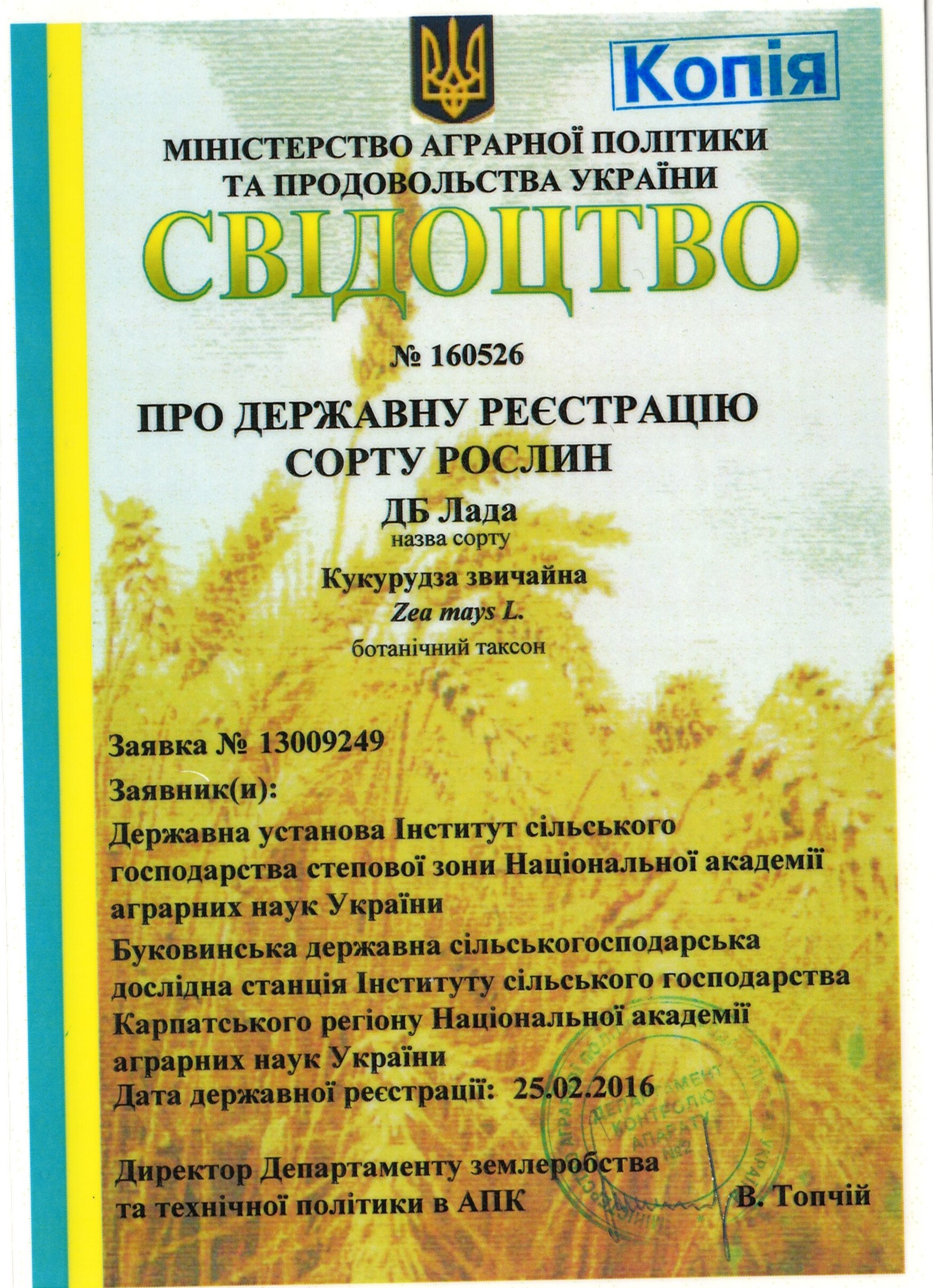 | 25.02.2016 | Кукурудза звичайна | ДБ Лада | 13009249 | Свідоцтво № 160526 |