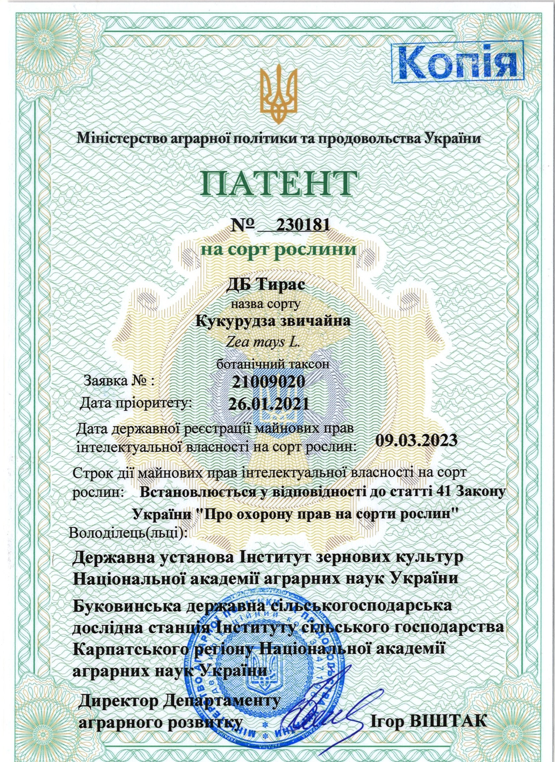 | 09.03.2023 | Кукурудза звичайна | ДБ Тирас | 21009020 | Патент на сорт рослин №230181 |