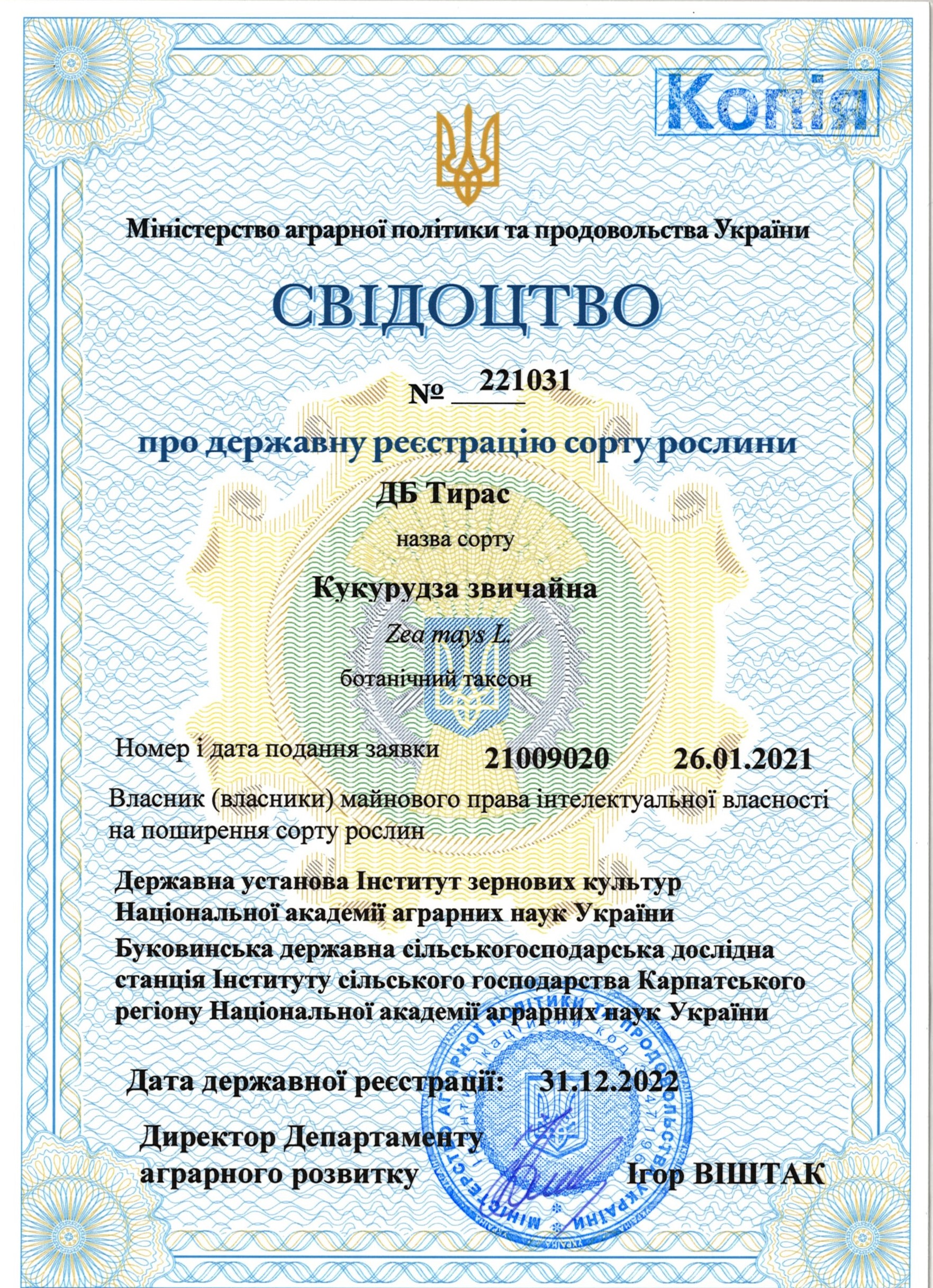 | 31.12.2022 | Кукурудза звичайна | ДБ Тирас | 21009020 | Свідоцтво № 221031 |