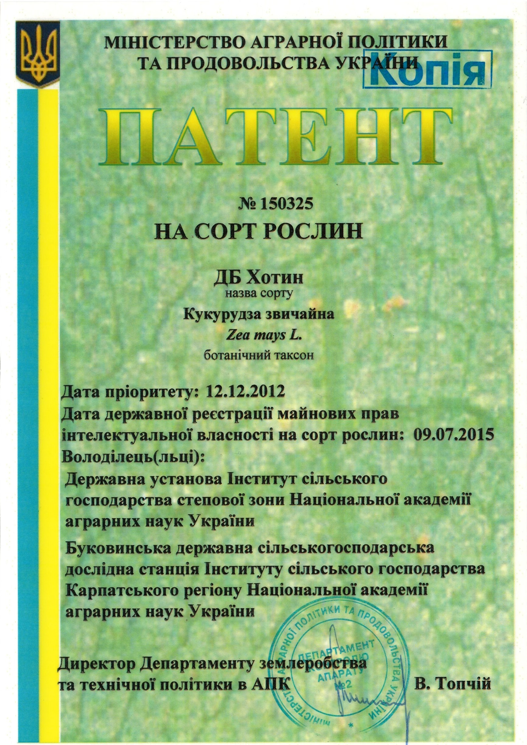 | 09.07.2015 | Кукурудза звичайна | ДБ Хотин | 12004203 | Патент на сорт рослин № 150325 |
