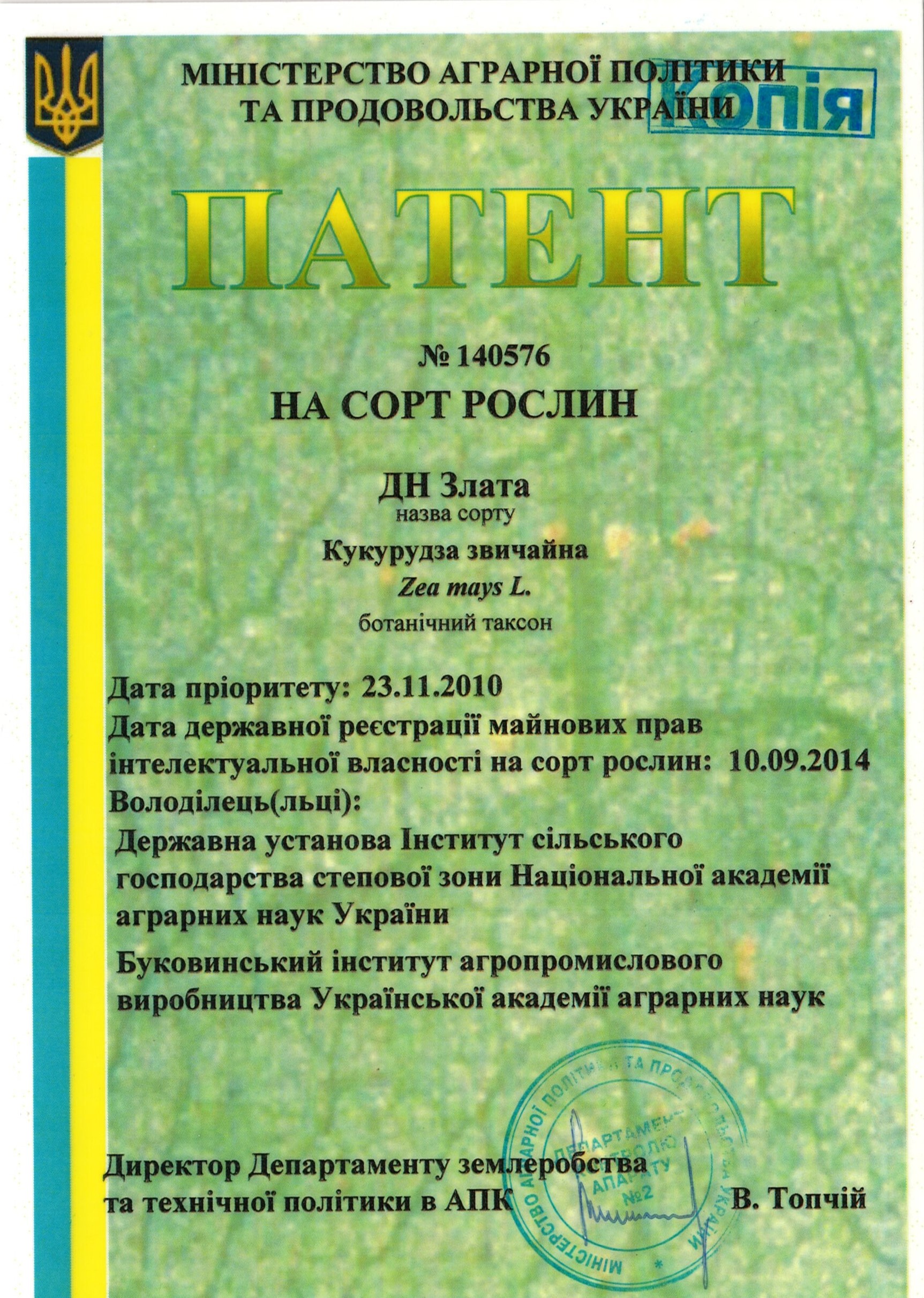 | 10.09.2014 | Кукурудза звичайна | ДН Злата | 10004127 | Патент на сорт рослин № 140576 |
