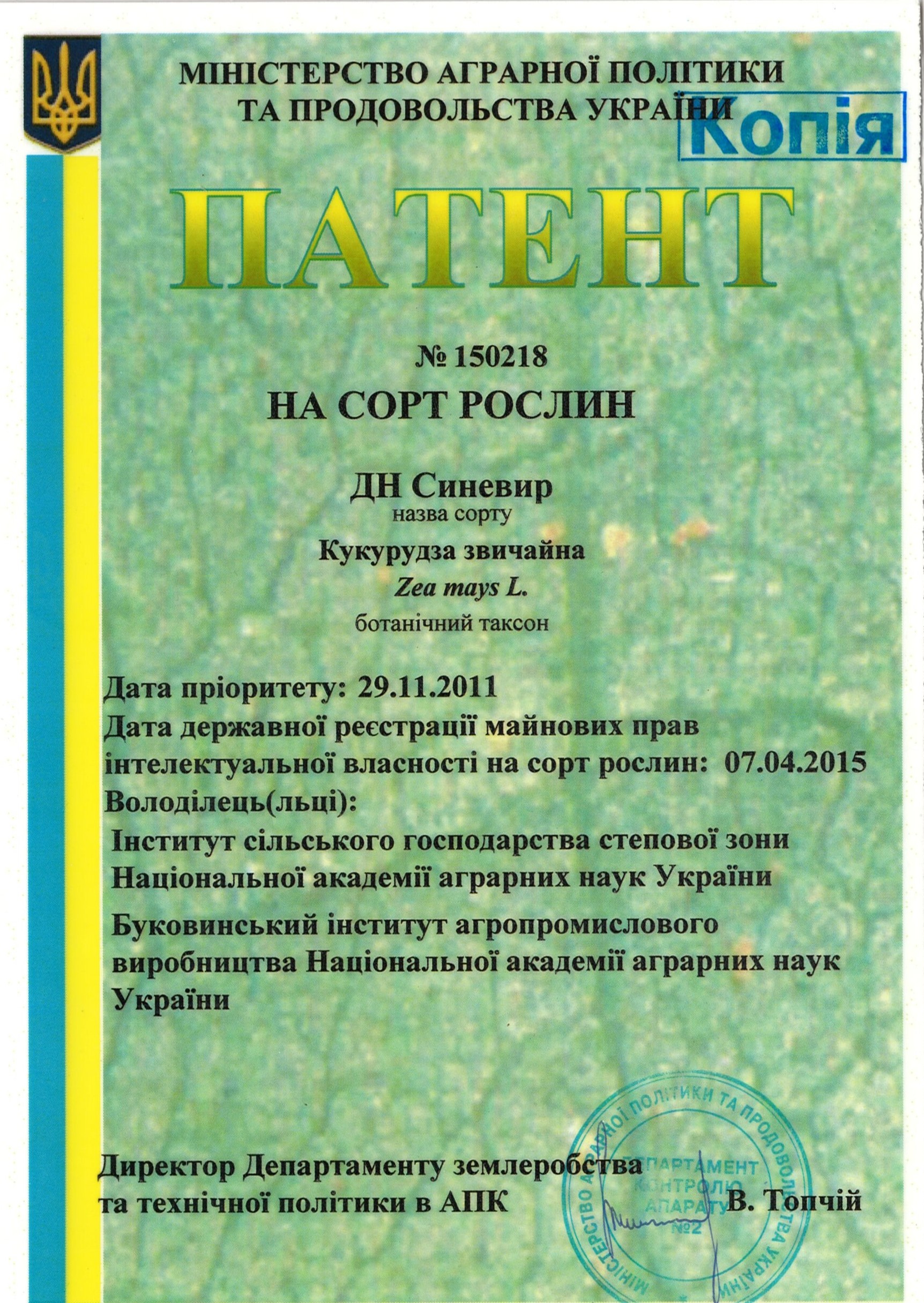 | 07.04.2015 | Кукурудза звичайна | ДН Синевир | 11004236 | Патент на сорт рослин №150218 |