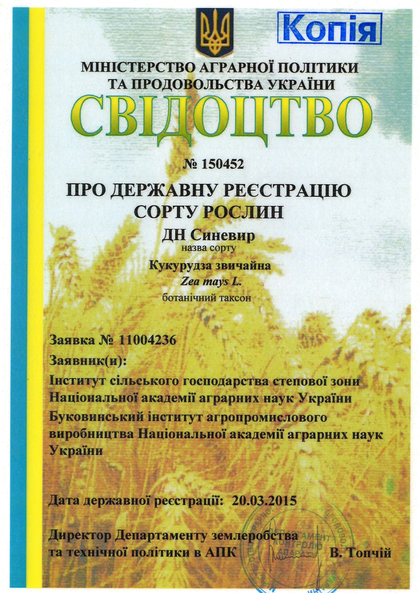 | 20.03.2015 | Кукурудза звичайна | ДН Синевир | 11004236 | Свідоцтво № 150452 |
