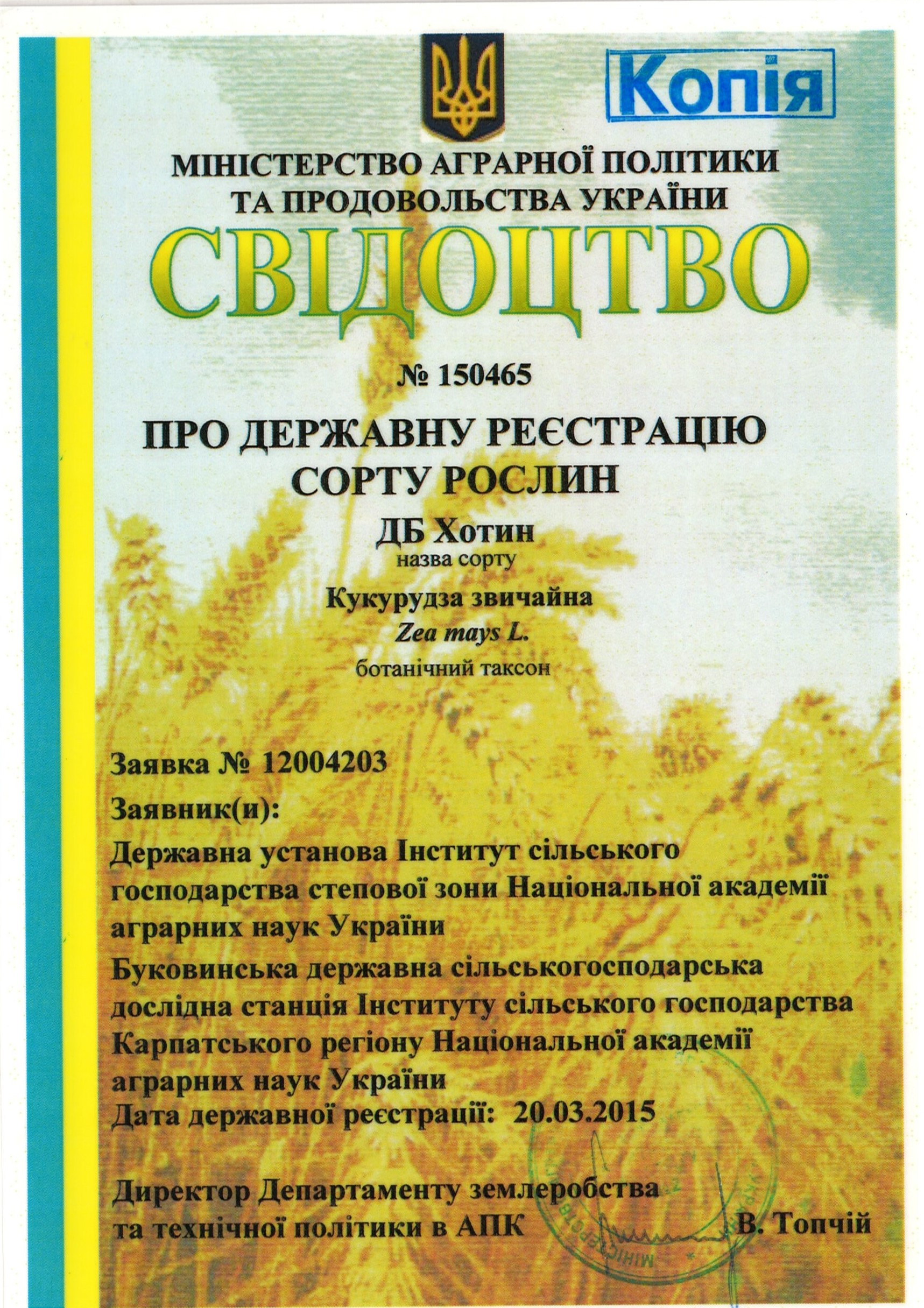 | 20.03.2015 | Кукурудза звичайна | ДБ Хотин | 12004203 | Свідоцтво № 150465 |