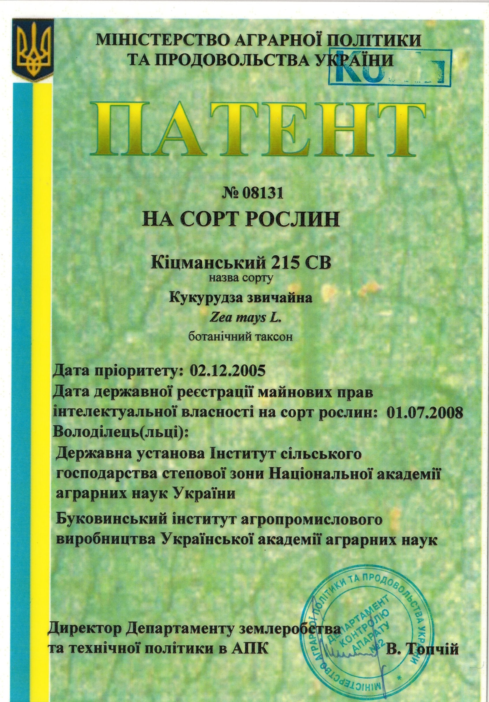 | 01.07.2008 | Кукурудза звичайна | Кіцманський 215 СВ | 05004062 | Патент на сорт рослин № 08131 |