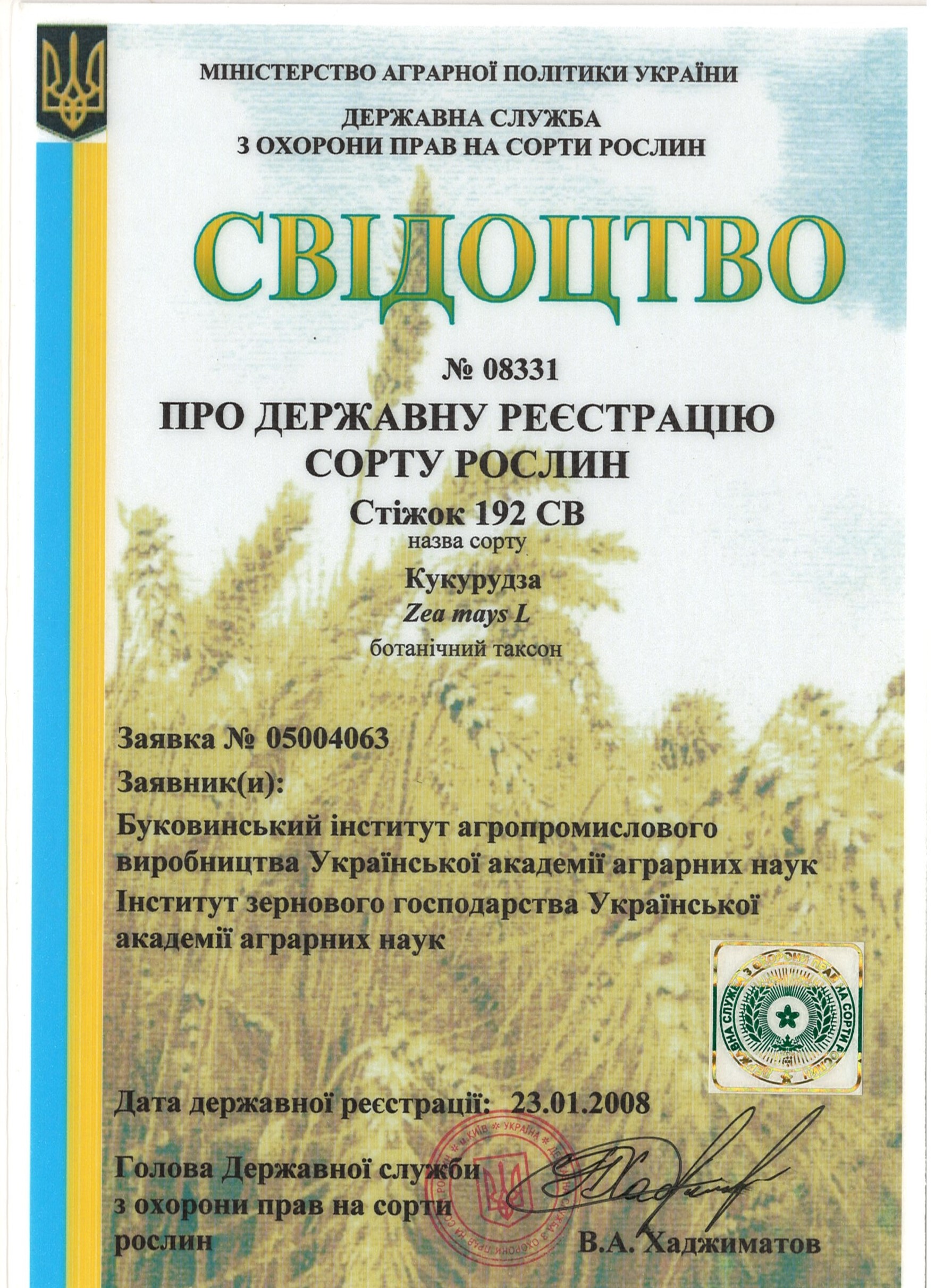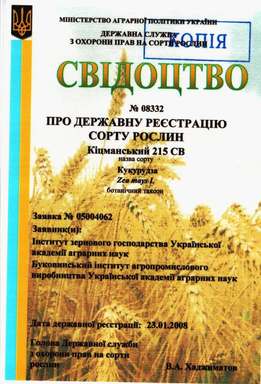 | 23.01.2008 | Кукурудза | Кіцманський 215 СВ | 05004062 | Свідоцтво №08332 |