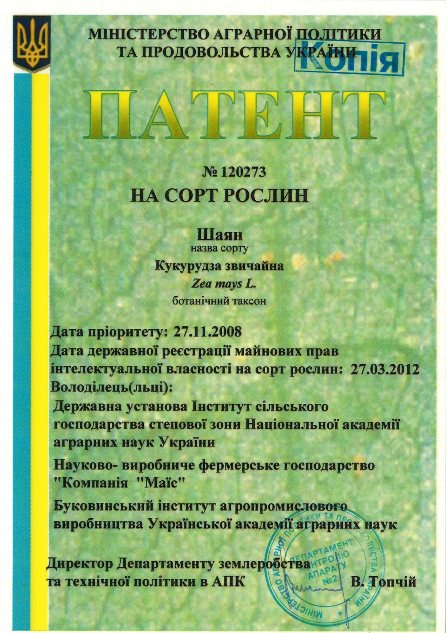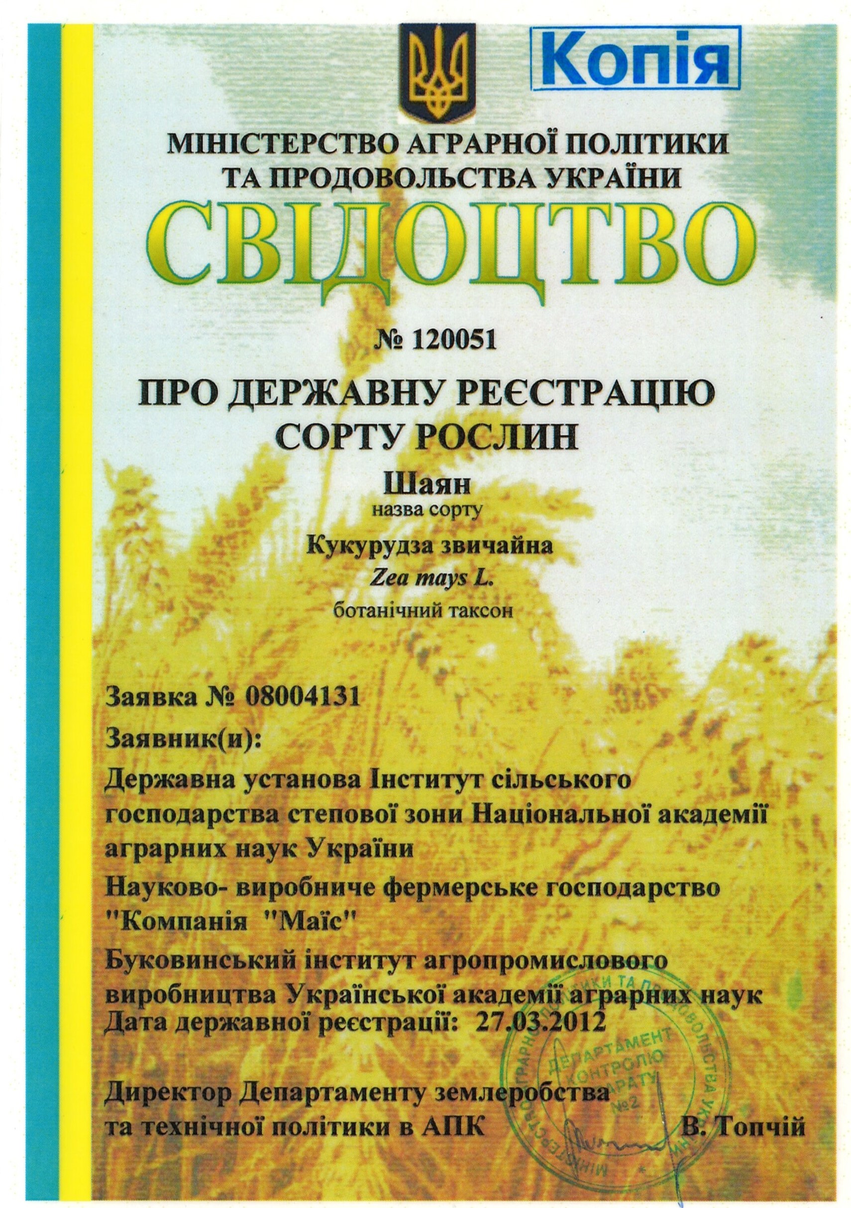 | 27.03.2012 | Кукурудза звичайна | Шаян | 08004131 | Свідоцтво №120051 |