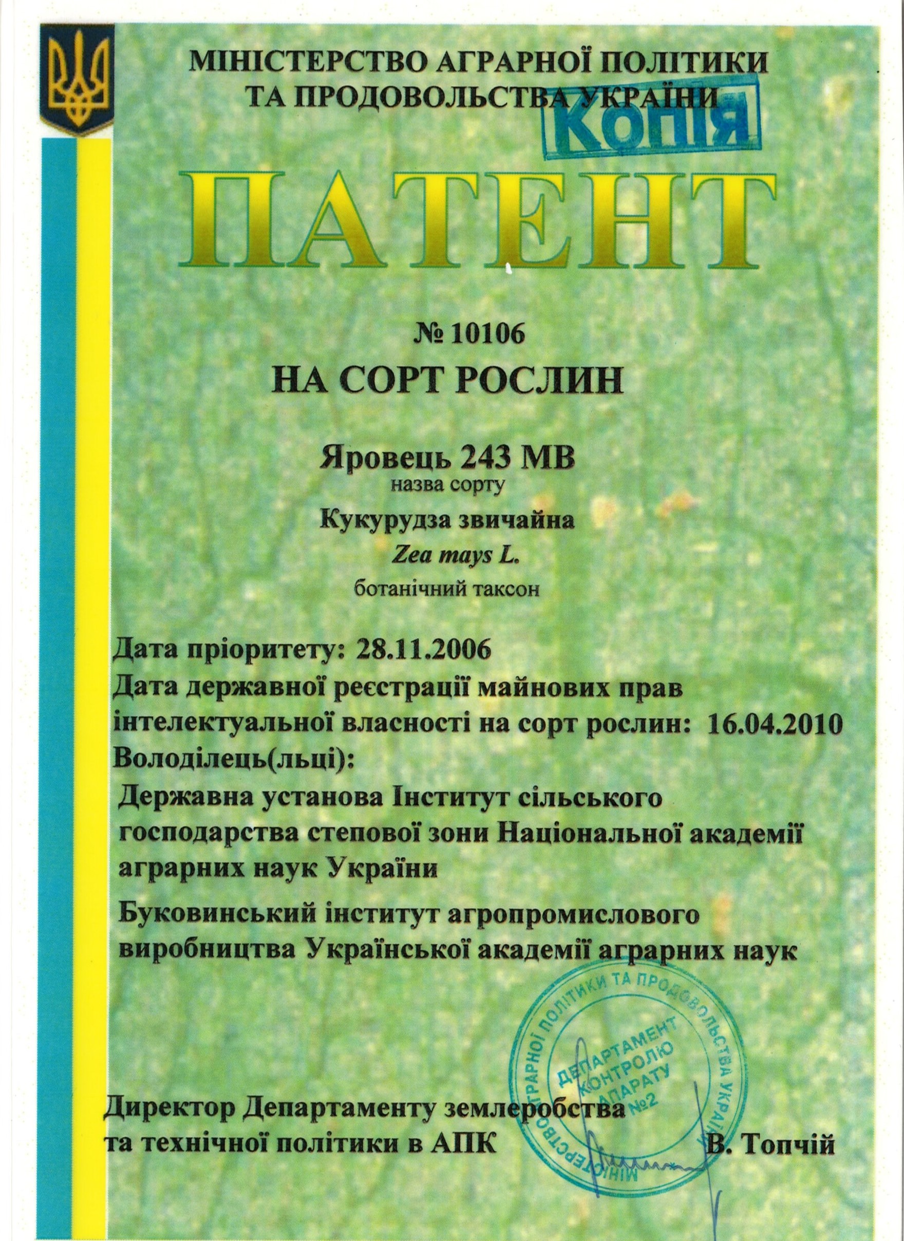 | 16.04.2010 | Кукурудза звичайна | Яровець 243 МВ | 06004070 | Патент на сорт рослин № 10106 |