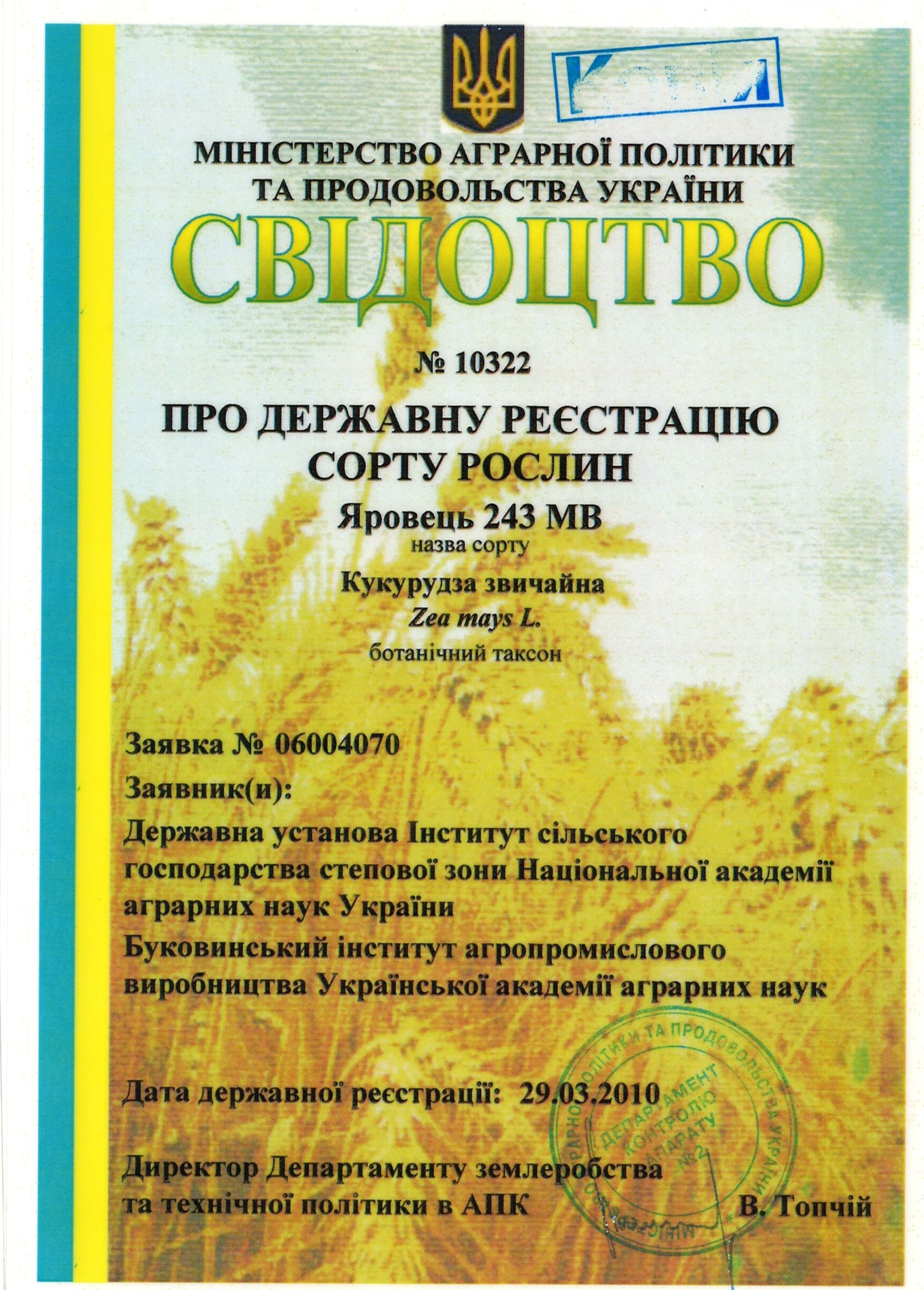 | 29.03.2010 | Кукурудза звичайна | Яровець 243 МВ | 06004070 | Свідоцтво №13022 |