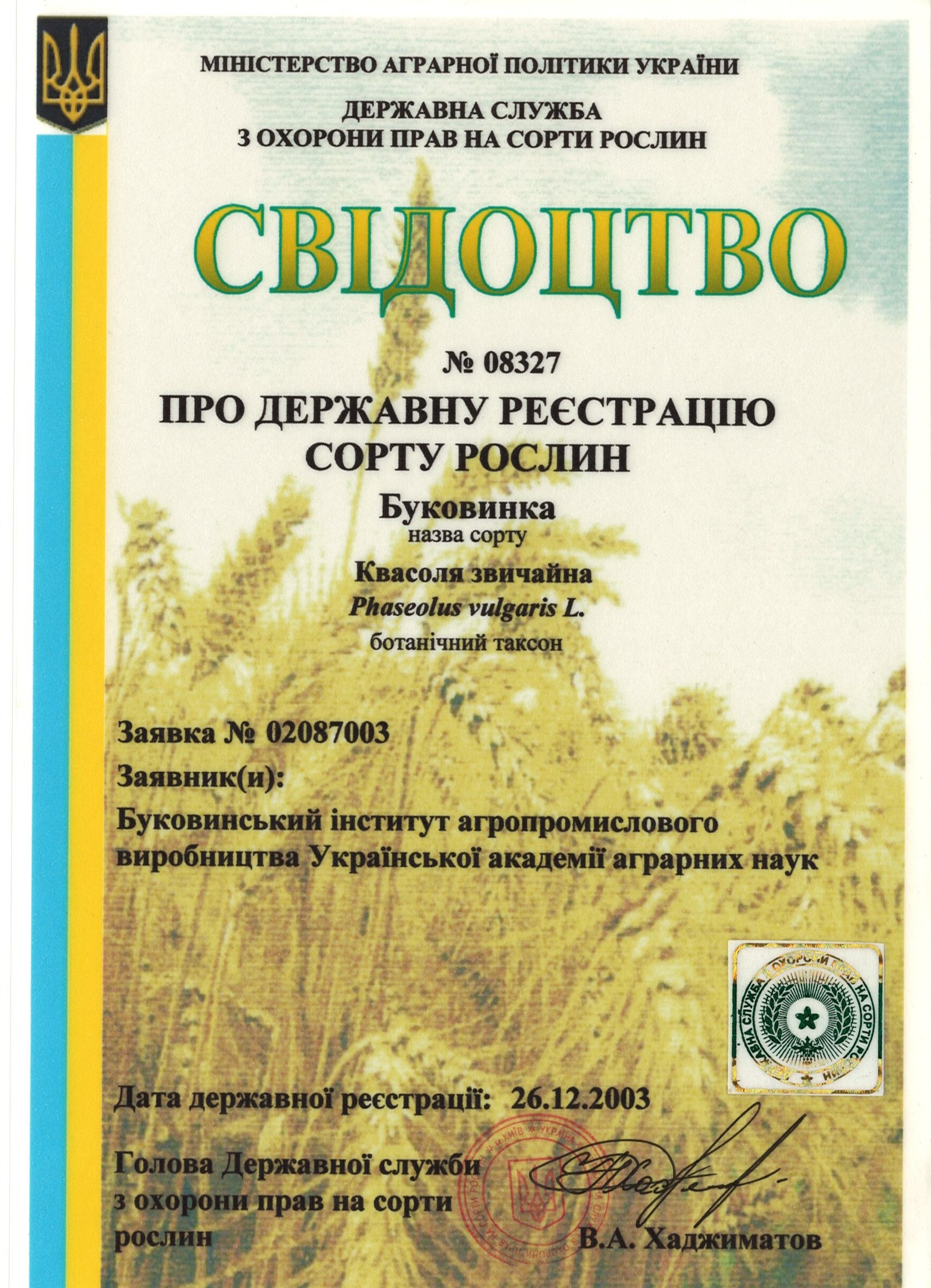 | 26.12.2003 | Квасоля звичайна | Буковинка | 02087003 | Свідоцтво №08327 |