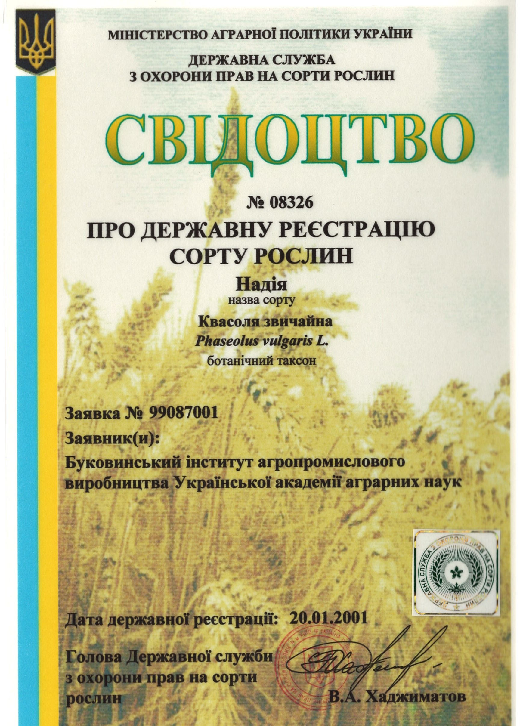 | 20.01.2001 | Квасоля звичайна | Надія | 99087001 | Свідоцтво №08326 |
