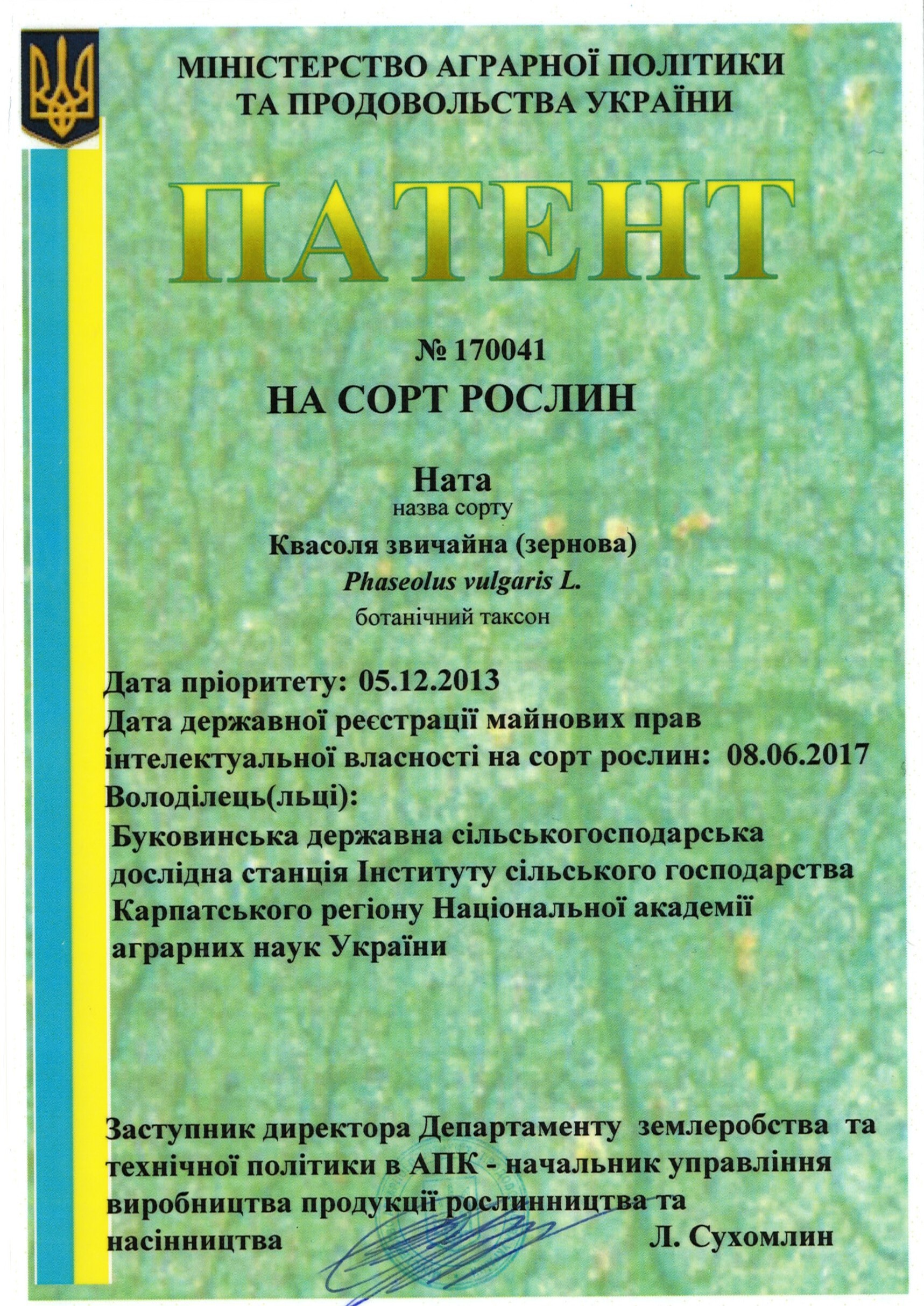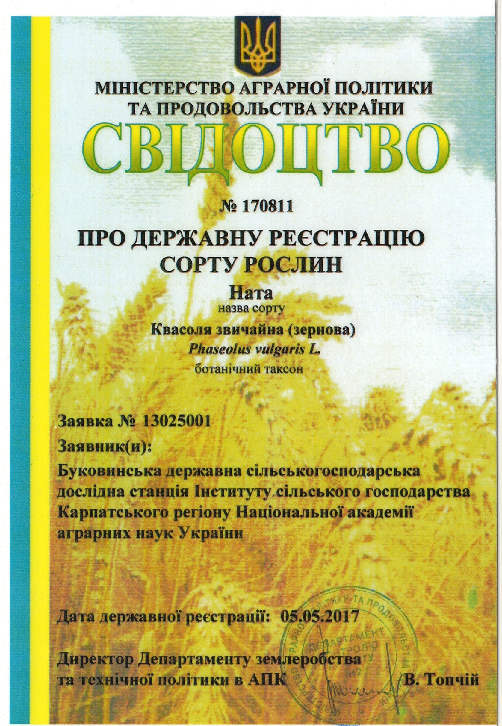 | 05.05.2017 | Квасоля звичайна (зернова) | Ната | 13025001 | Свідоцтво № 170811 |