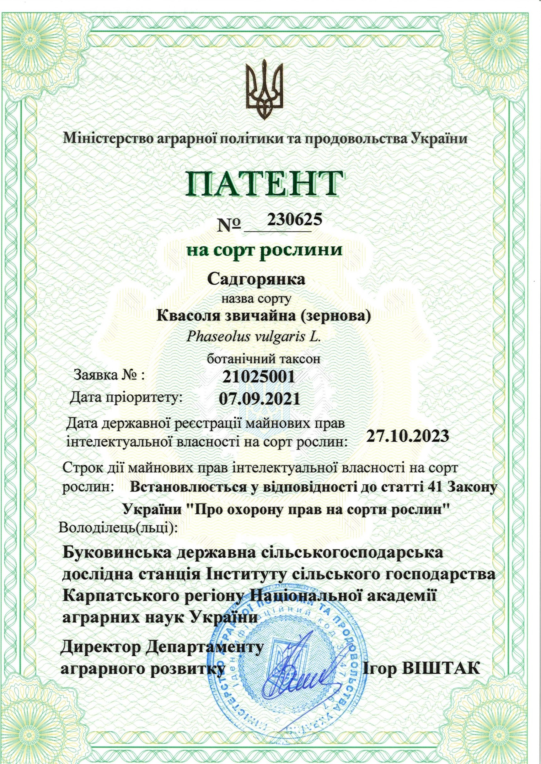 | 27.10.2023 | Квасоля звичайна (зернова) | Садгорянка | 21025001 | Патент на сорт рослин №230625 |