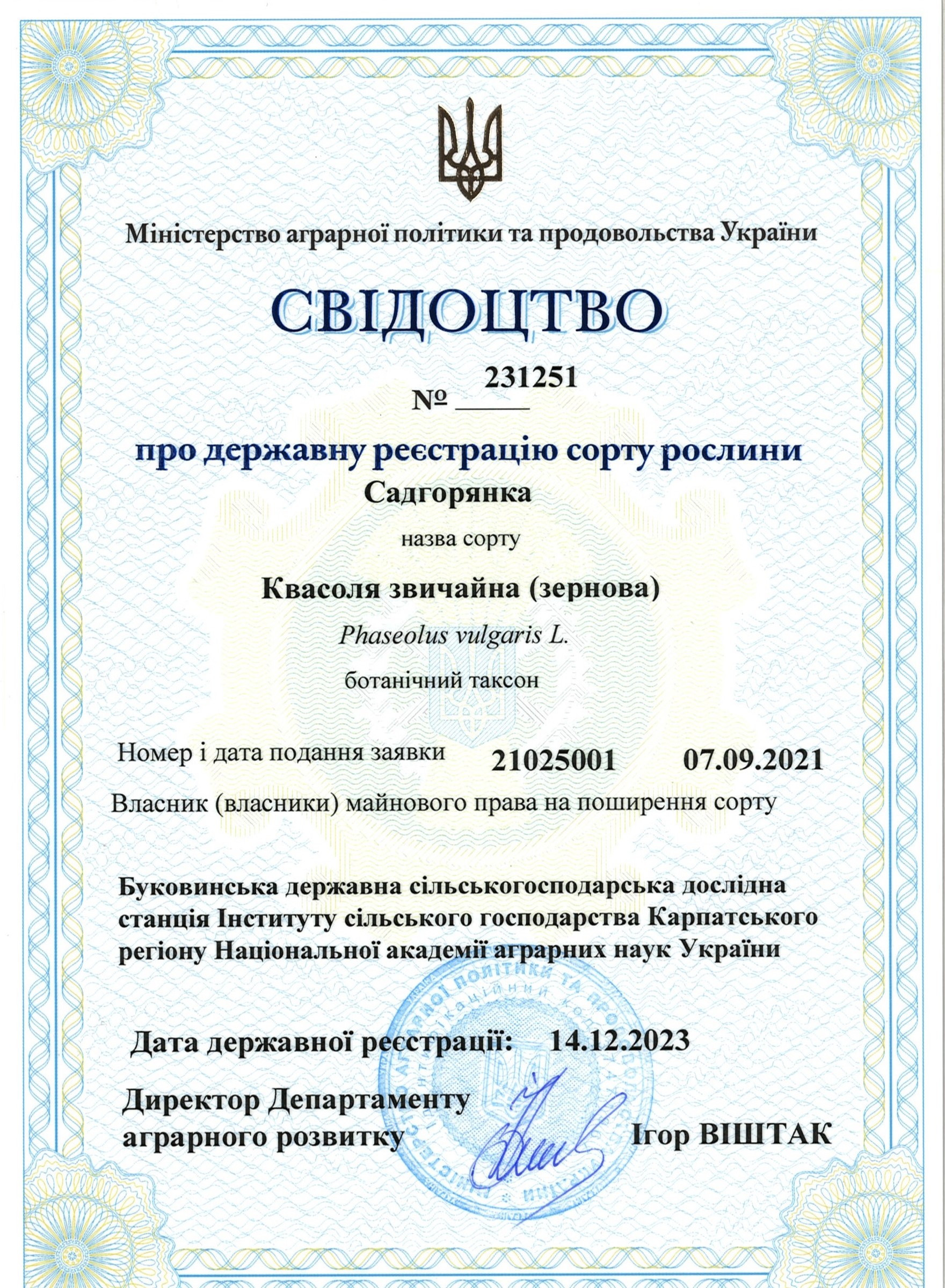 | 14.12.2023 | Квасоля звичайна (зернова) | Садгорянка | 21025001 | Свідоцтво №231251 |