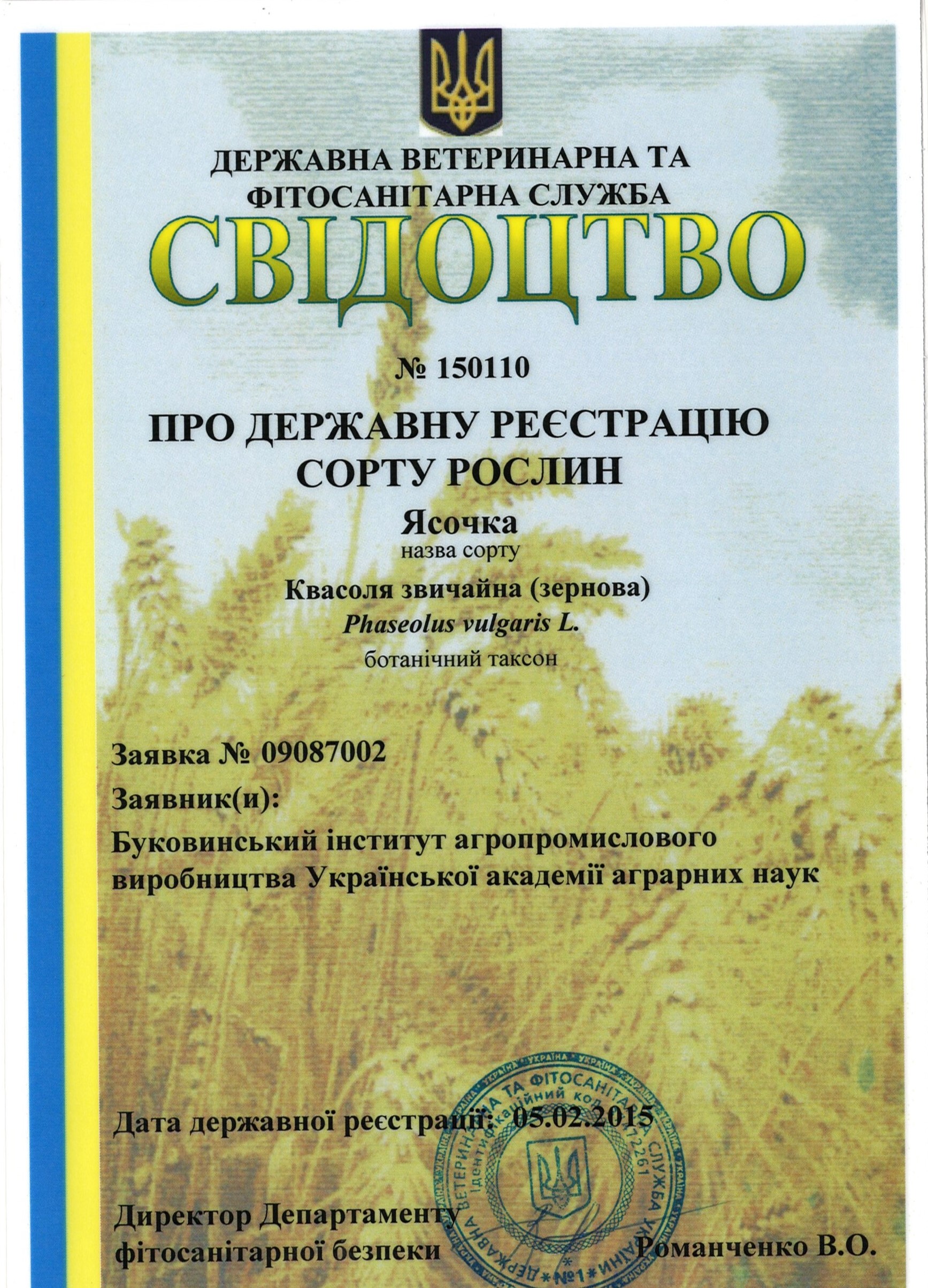 | 05.02.2015 | Квасоля звичайна (зернова) | Ясочка | 09087002 | Свідоцтво №15110 |