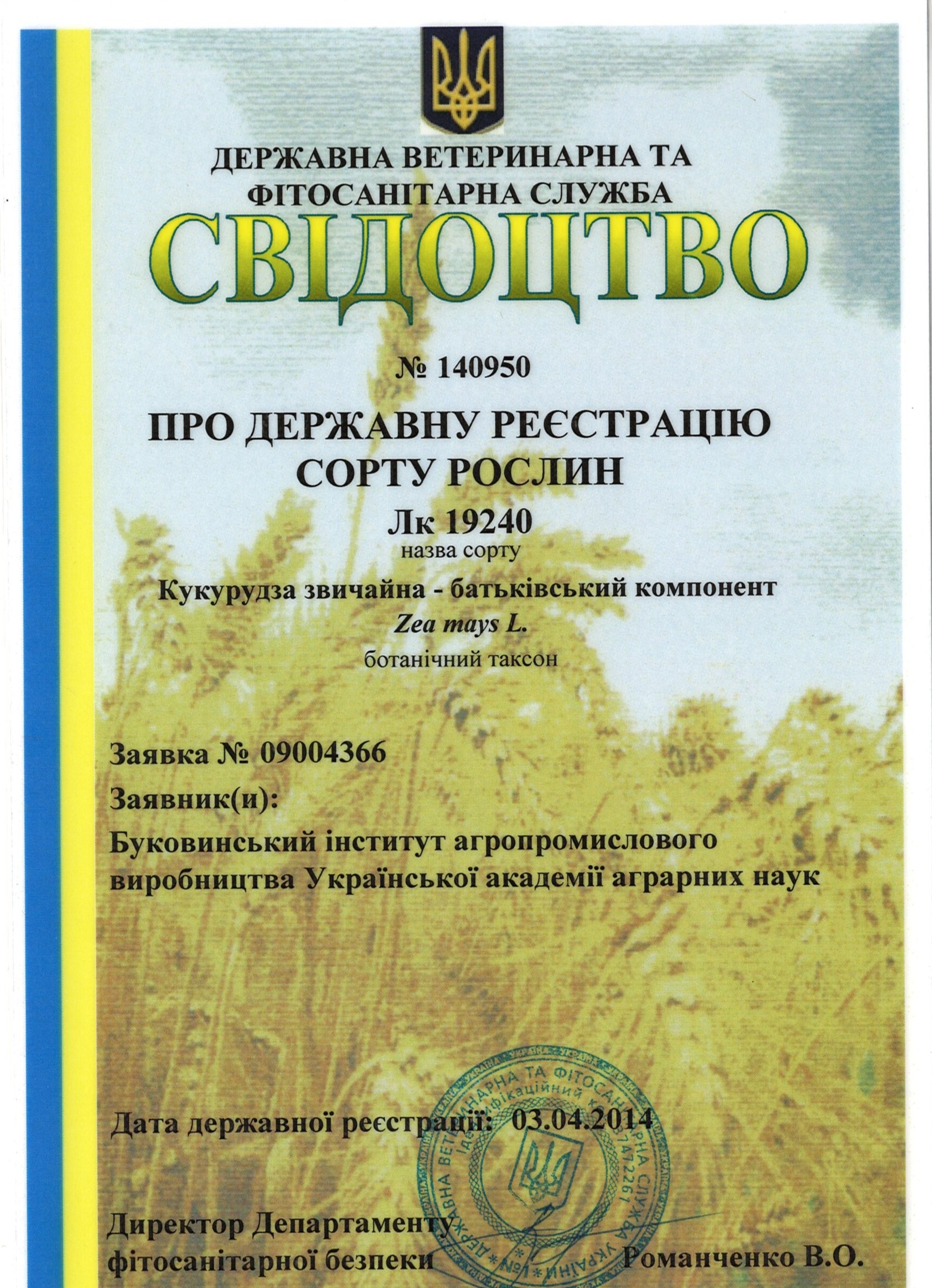 | 03.04.2014 | Кукурудза звичайна – батьківський компонент | Лк 19240 | 09004366 | Свідоцтво №140950 |