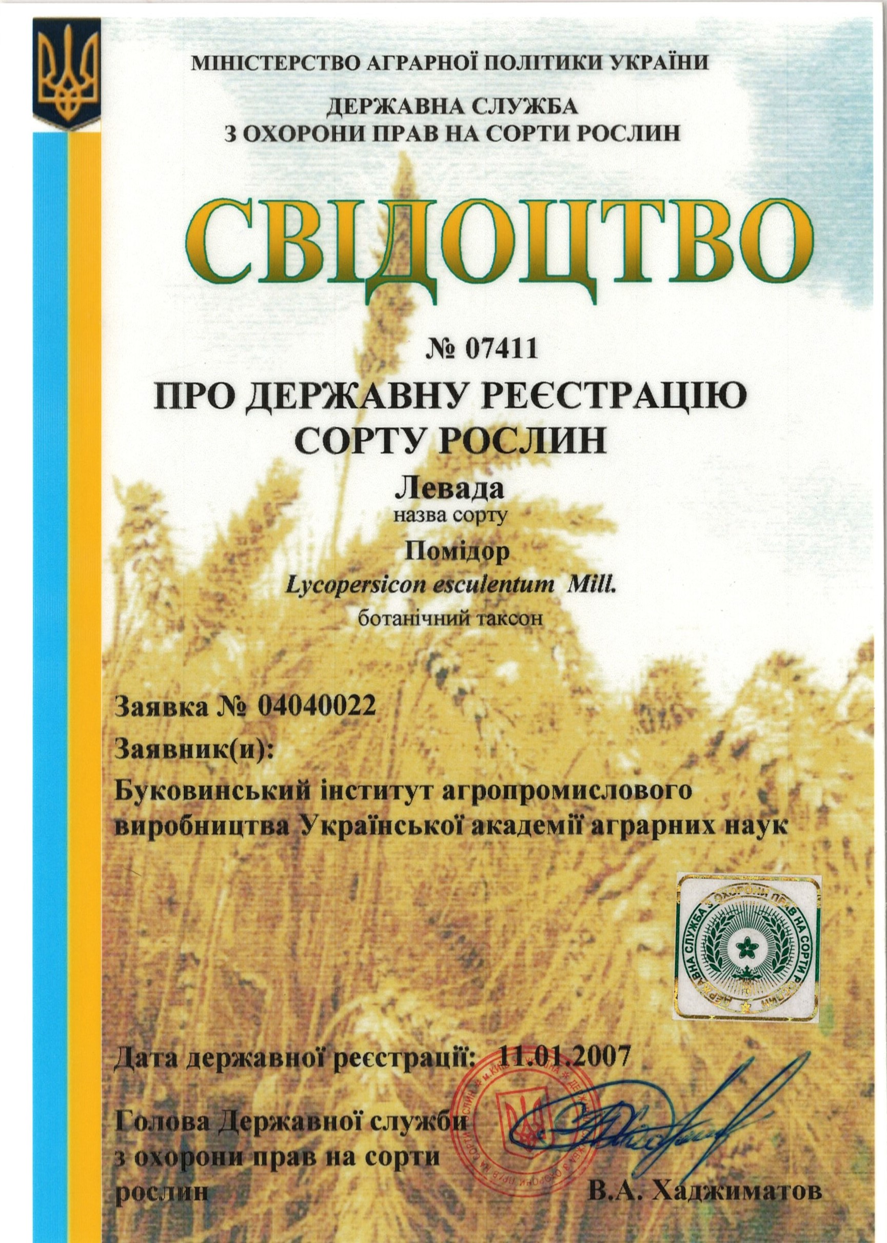 | 11.01.2007 | Помідор | Левада | 04040022 | Свідоцтво №07411 |