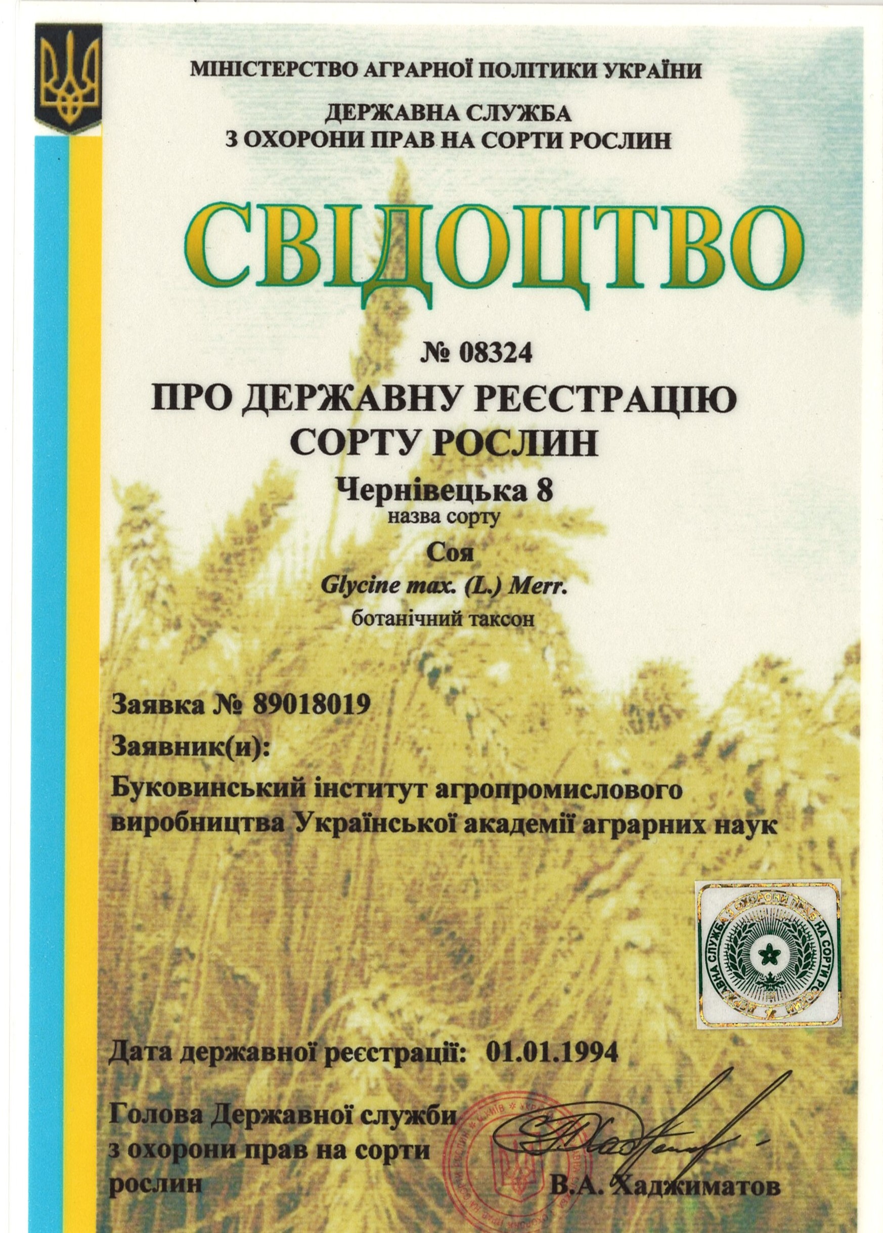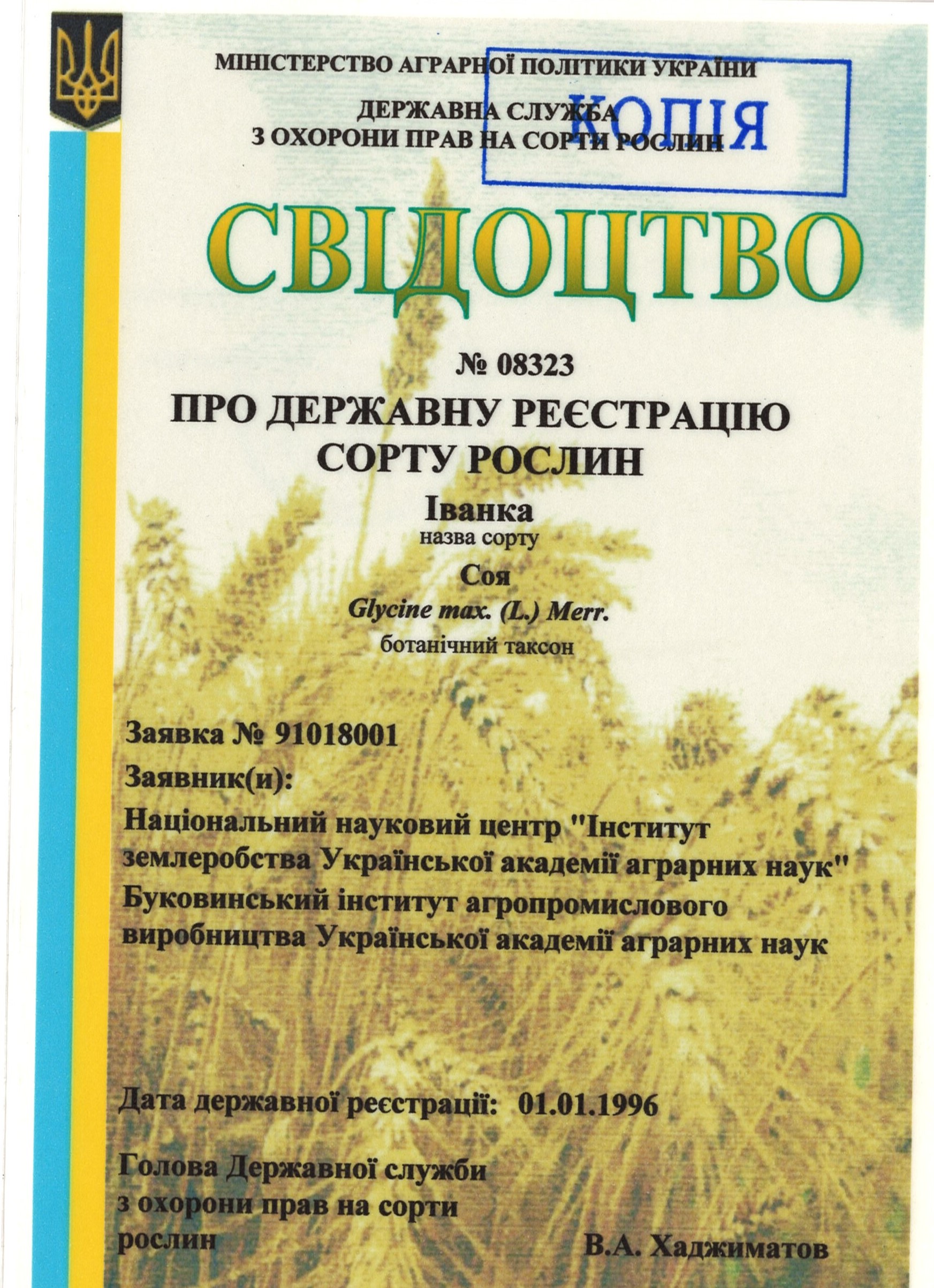 | 01.01.1996 | Соя | Іванка | 91018001 | Свідоцтво №08323 |