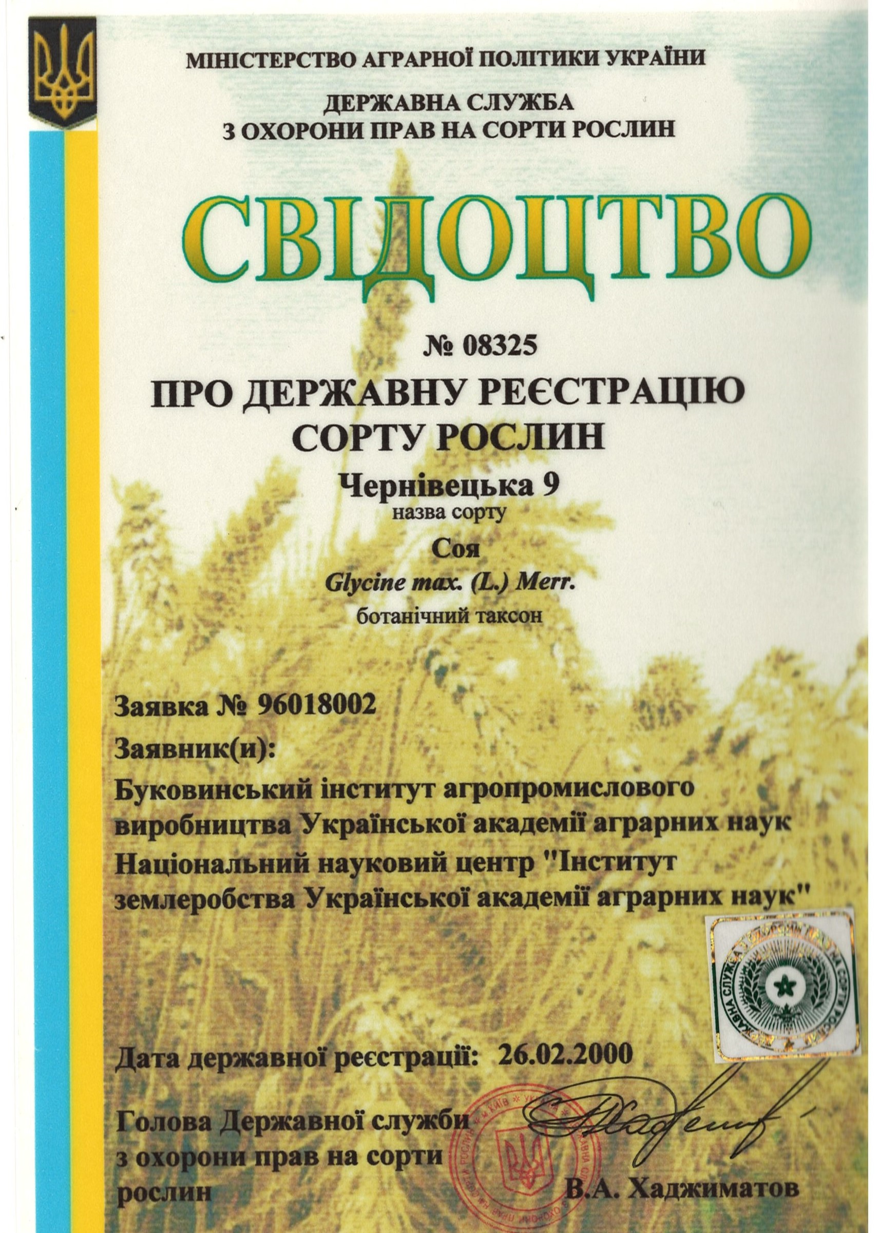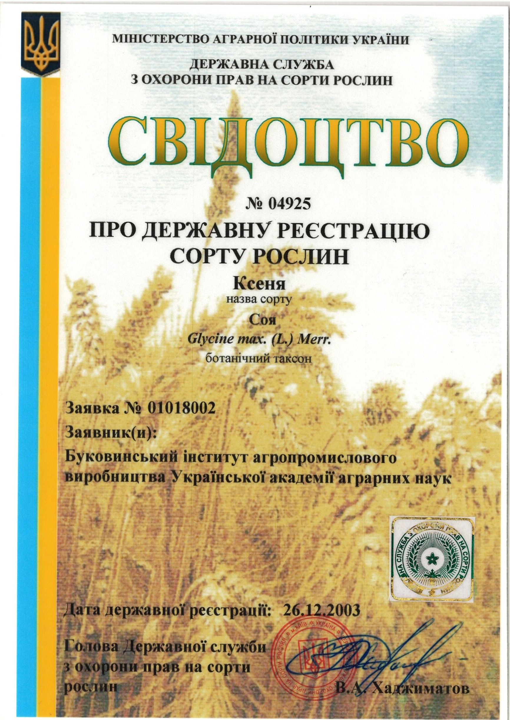 | 26.12.2003 | Соя | Ксеня | 01018002 | Свідоцтво №04925 |