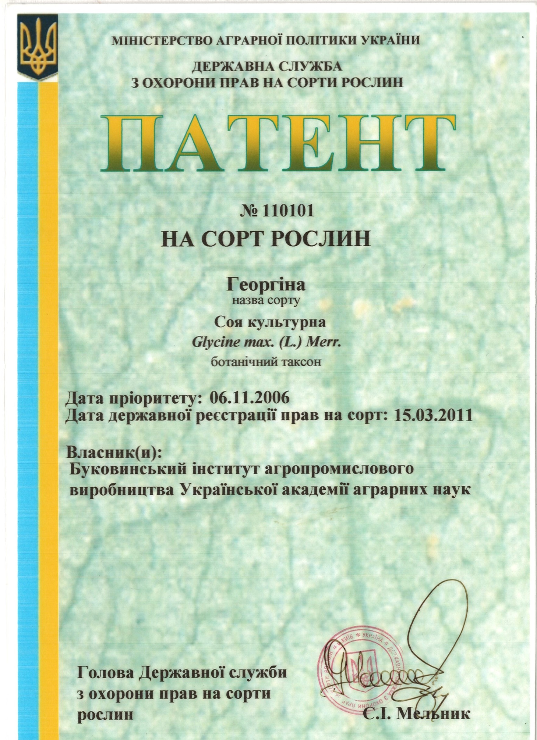 | 15.03.2011 | Соя культурна | Георгіна | 06018007 | Патент на сорт рослин №110101 |