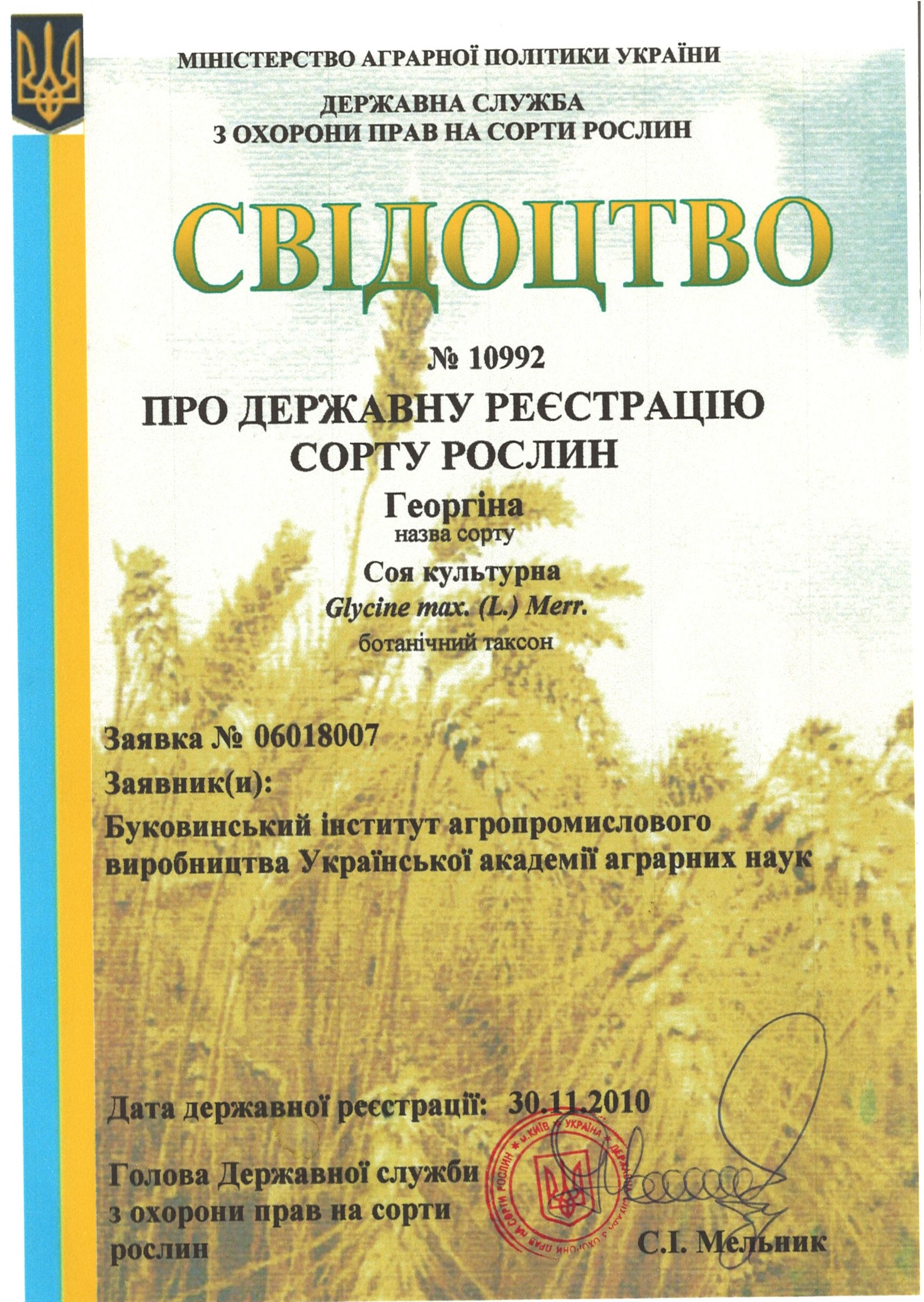 | 30.11.2010 | Соя культурна | Георгіна | 06018007 | Свідоцтво №10992 |