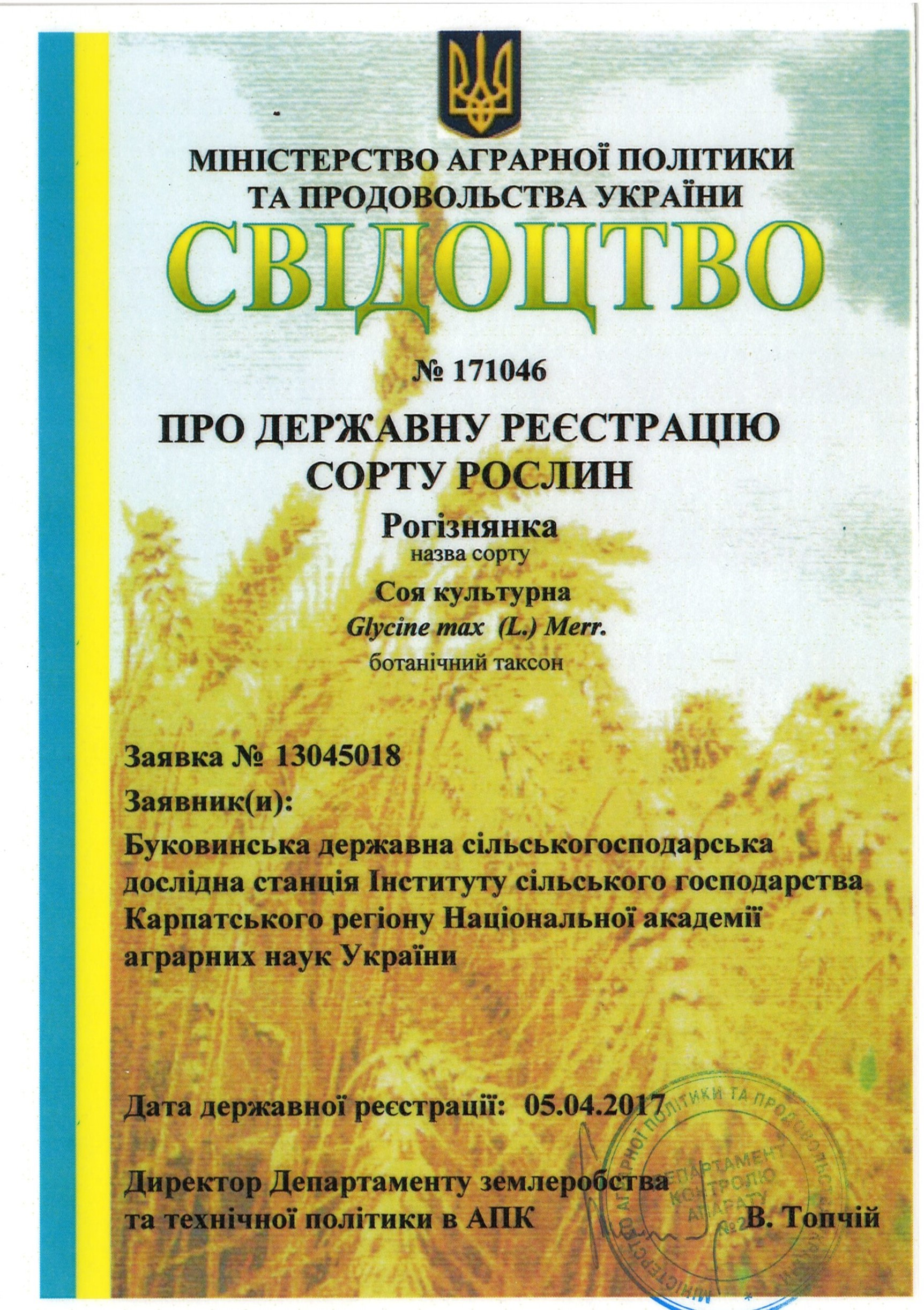 | 05.04.2017 | Соя культурна | Рогізнянка | 13045018 | Свідоцтво №171046 |